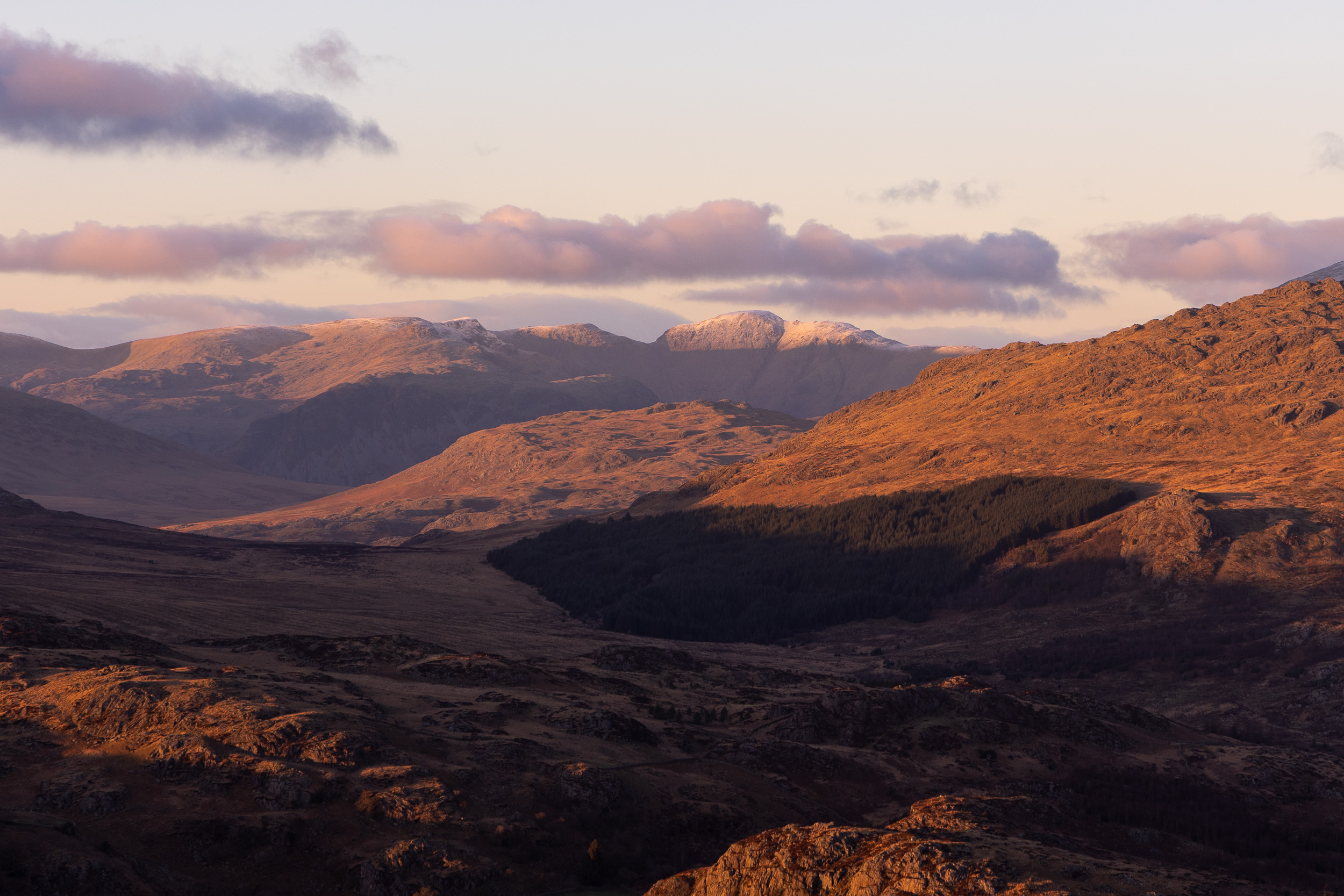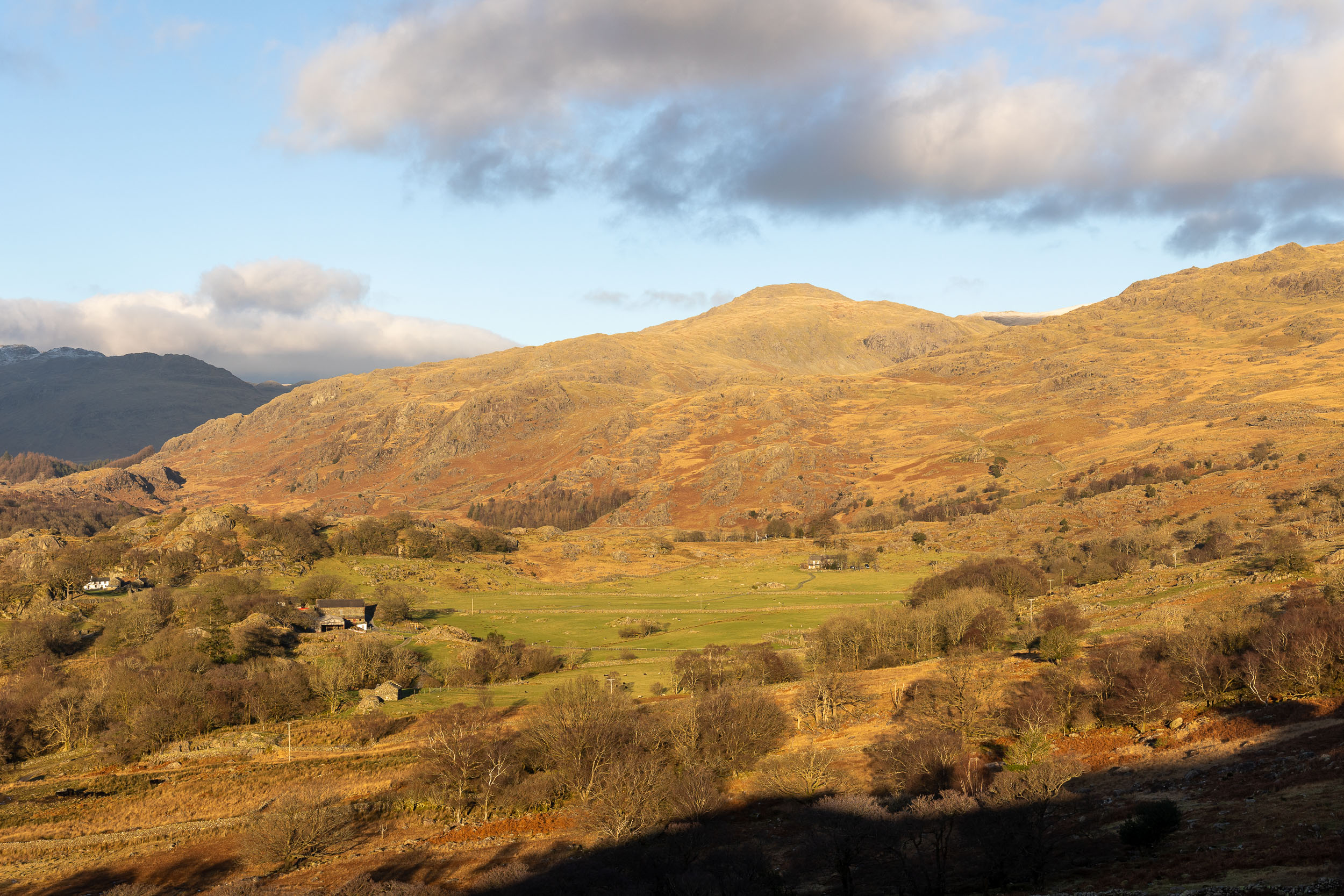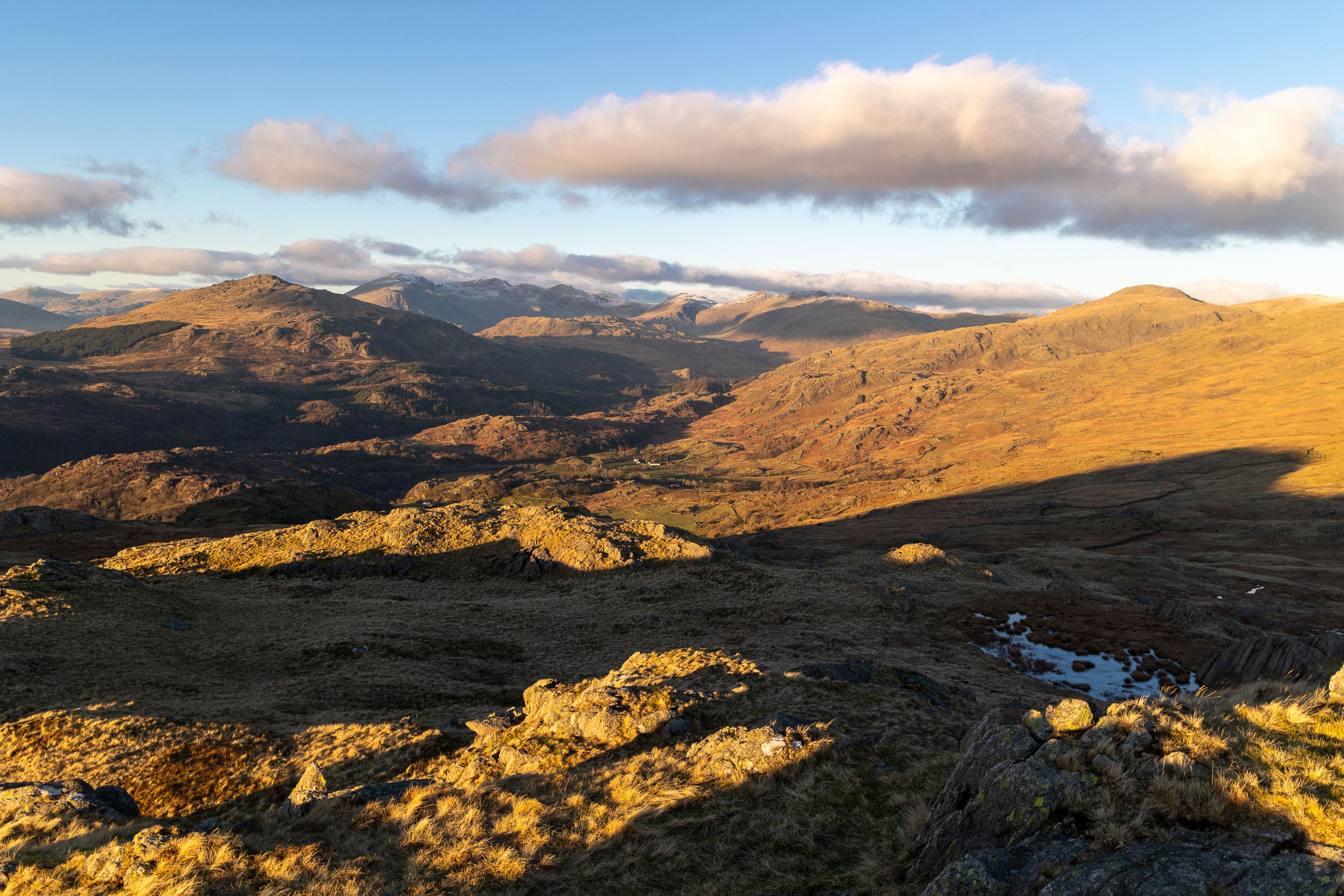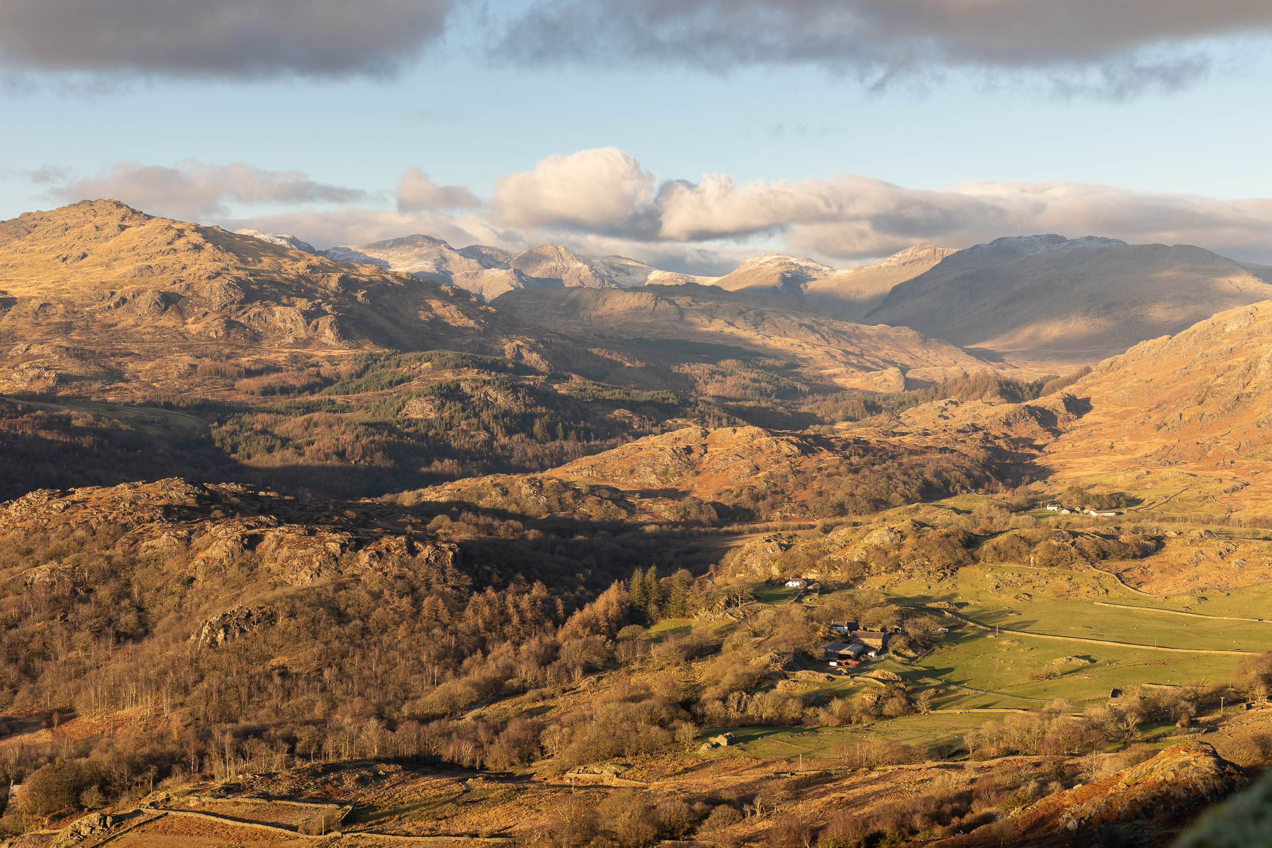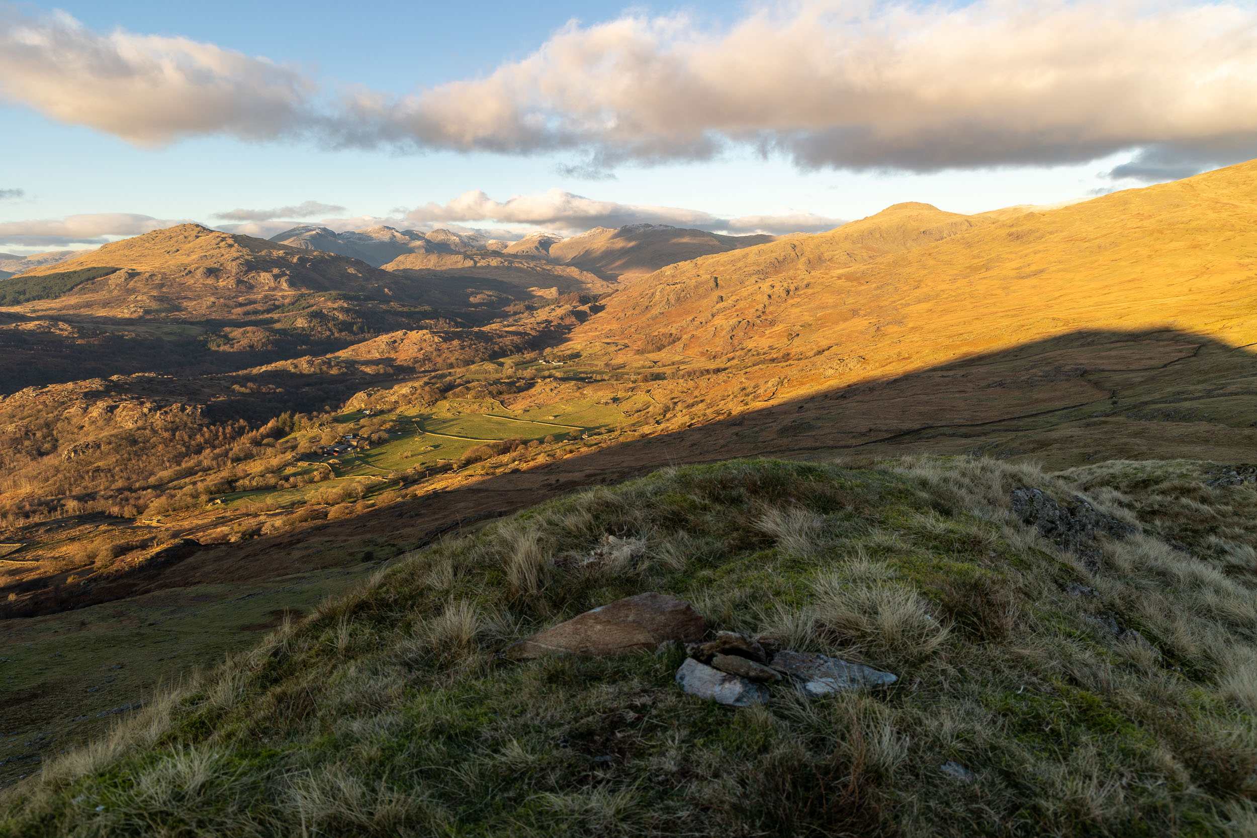 A great, wintry view along the Duddon Valley from the steep climb to Green Pikes. Harter Fell is on the left and the Scafells beyond with a sprinkling of snow on them.