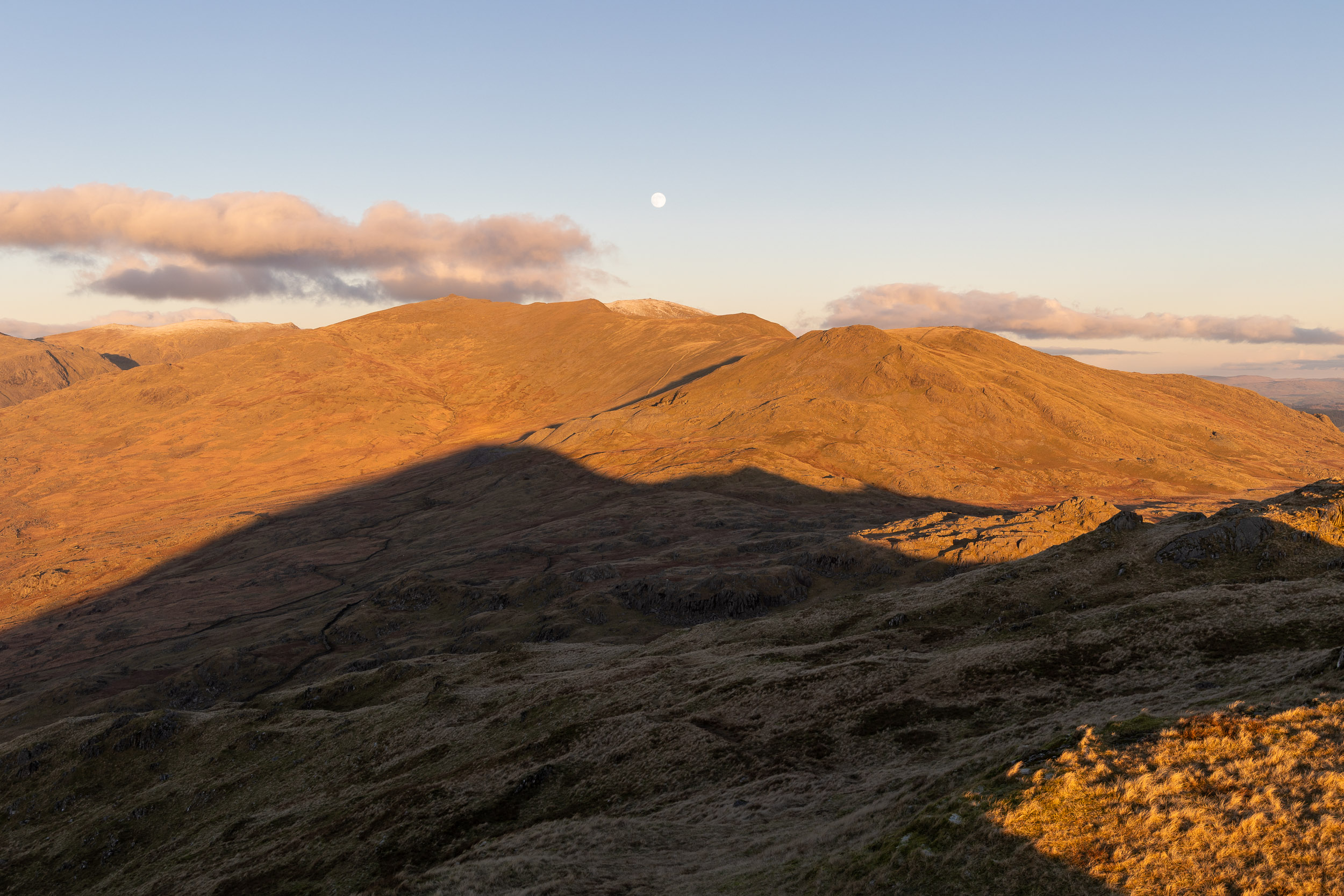 The moon is noticeably higher over The Old Man now and the shadows ever lengthening. Pikes is still catching the sunlight, centre right.