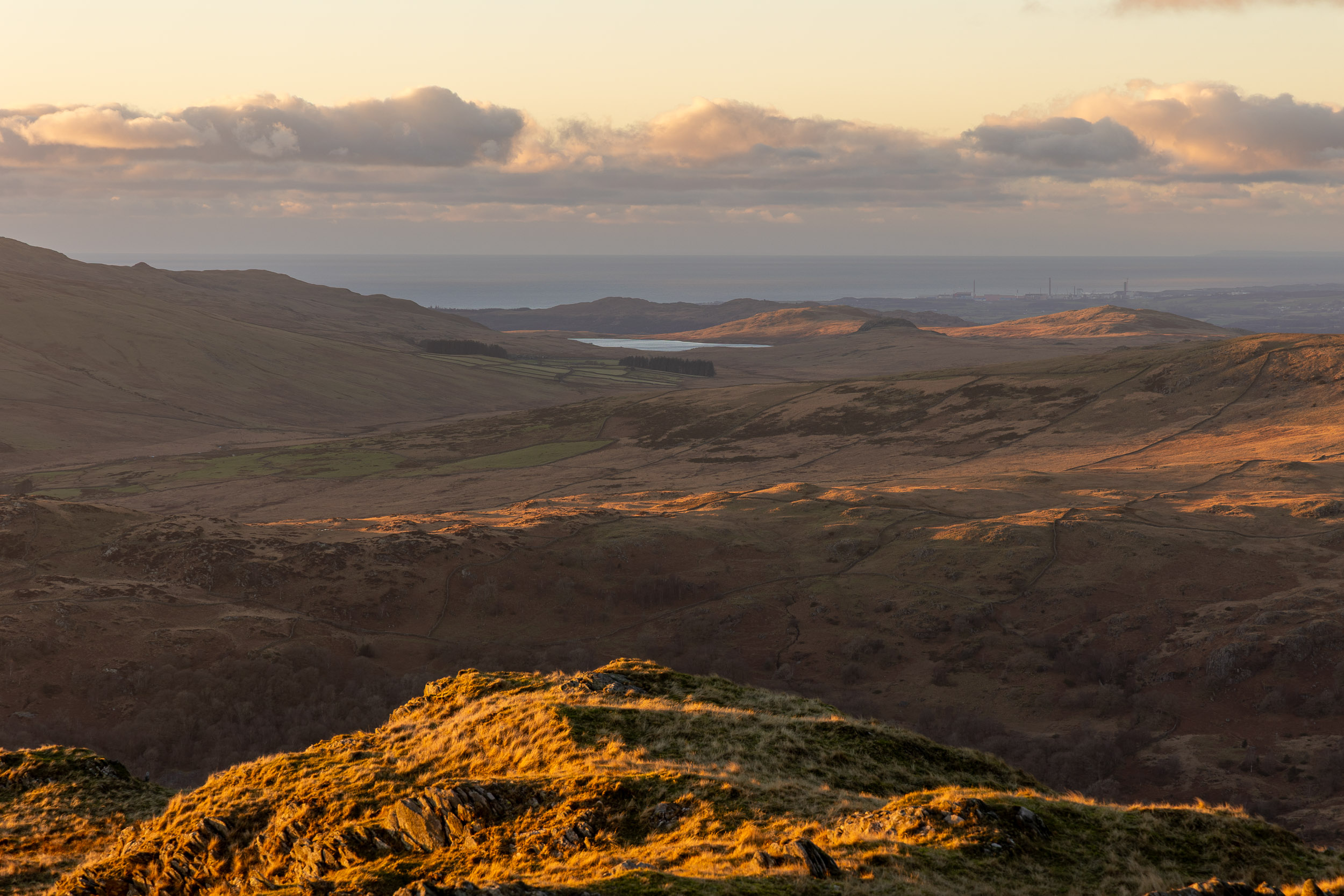 Looking out to the west Cumbrian coast, Devoke Water nestling on Birker Fell with Sellafield works visible beyond.