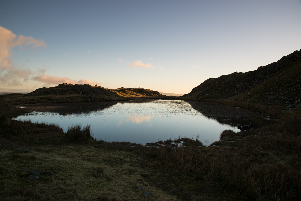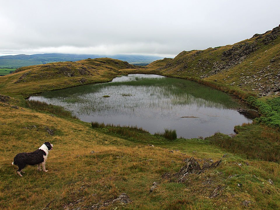 It was sunny at home this morning but further inland over the Lakeland fells there was lots of low lying cloud. The only place with any light it seemed was the south-western corner and even that was looking a bit hit and miss. It is always an enjoyable and relatively easy round at Dunnerdale. The clouds were scooting through all the time and it was pretty breezy up on the tops. At least it was a chance for Dougal to get out again!