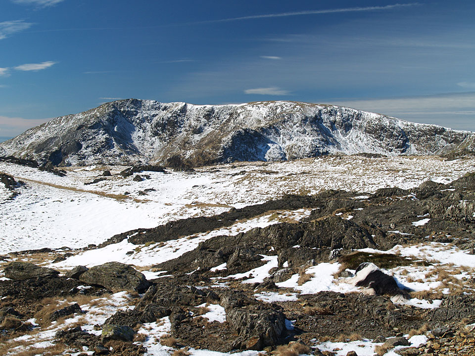 Coniston Old Man and Brim Fell come into view at the top of Steel Edge. Casper has a quick lie down!