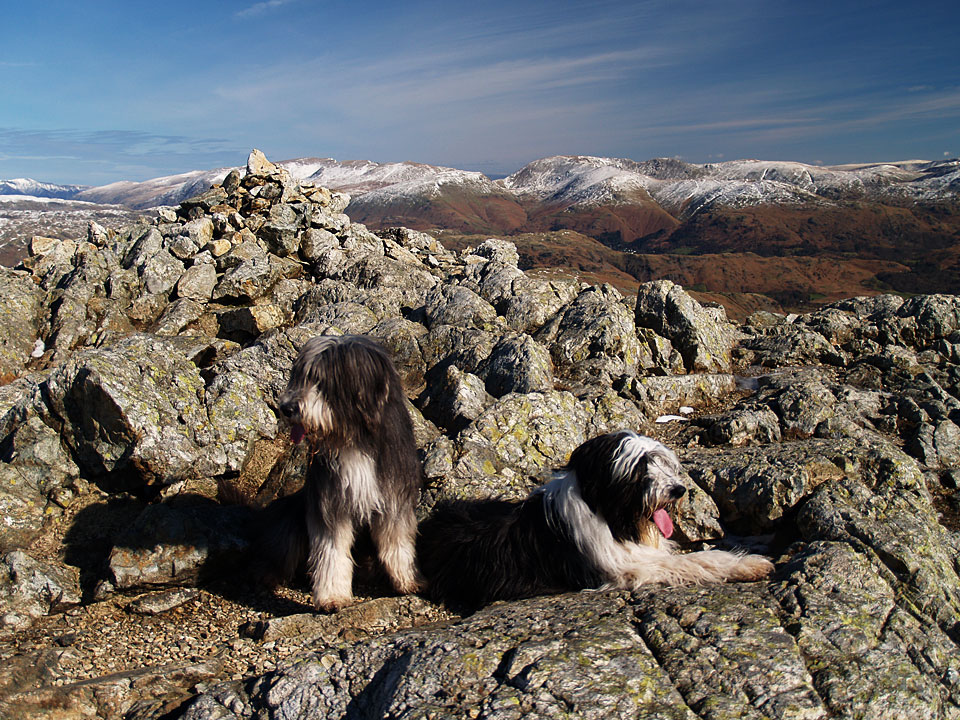 Tongues out on the summit of Wetherlam for Angus and Casper.