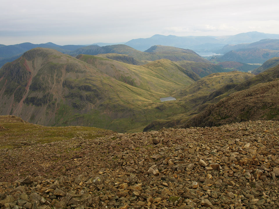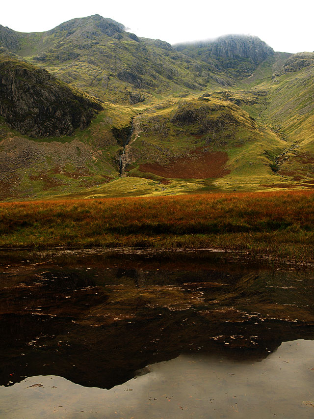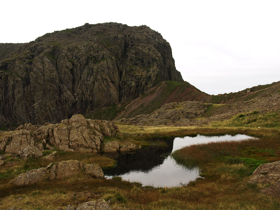 Broad Stand from Broadcrag Tarn - the highest tarn in the Lake District at 827m according to Wainwright and Birkett...but my mapping software shows Foxes tarn at 837m and Crinkle Crags Tarn (near the summit of Long Top, un-named on the OS map) at 854m. Now, should I climb Lord's Rake and climb Scafell or descend Cam Spout? Oops, look at the time - lets go!