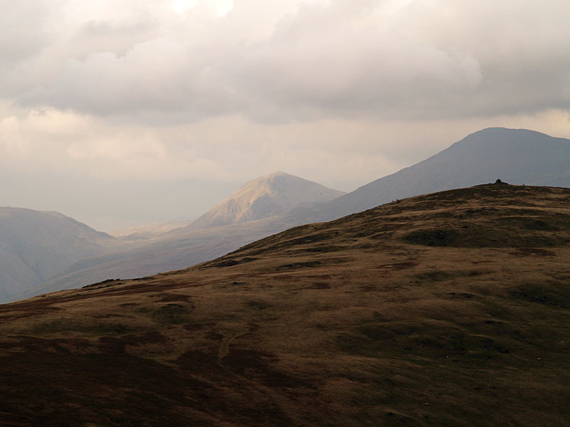 Kirk Fell picks up the sun 12 miles to the north-east with the silhouette of Scafell to the right beyond Whitfell.