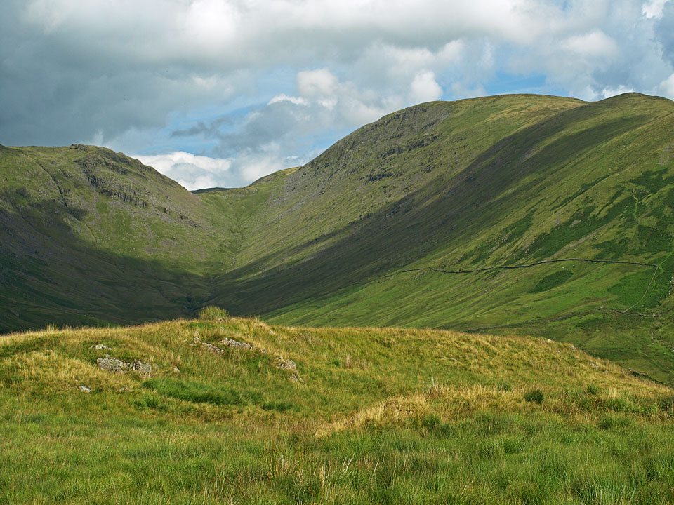 Caudale Moor and Thornthwaite Crag either side of Threshthwaite Mouth. Gray Crag can just be seen through the gap.