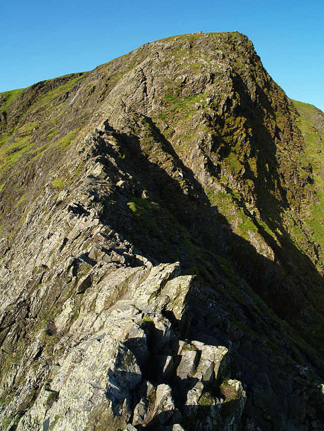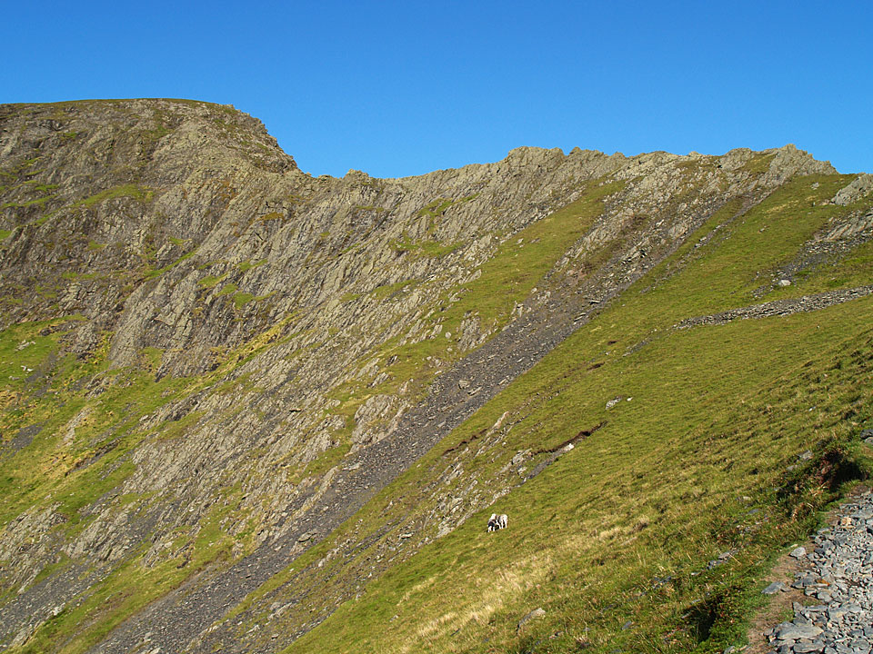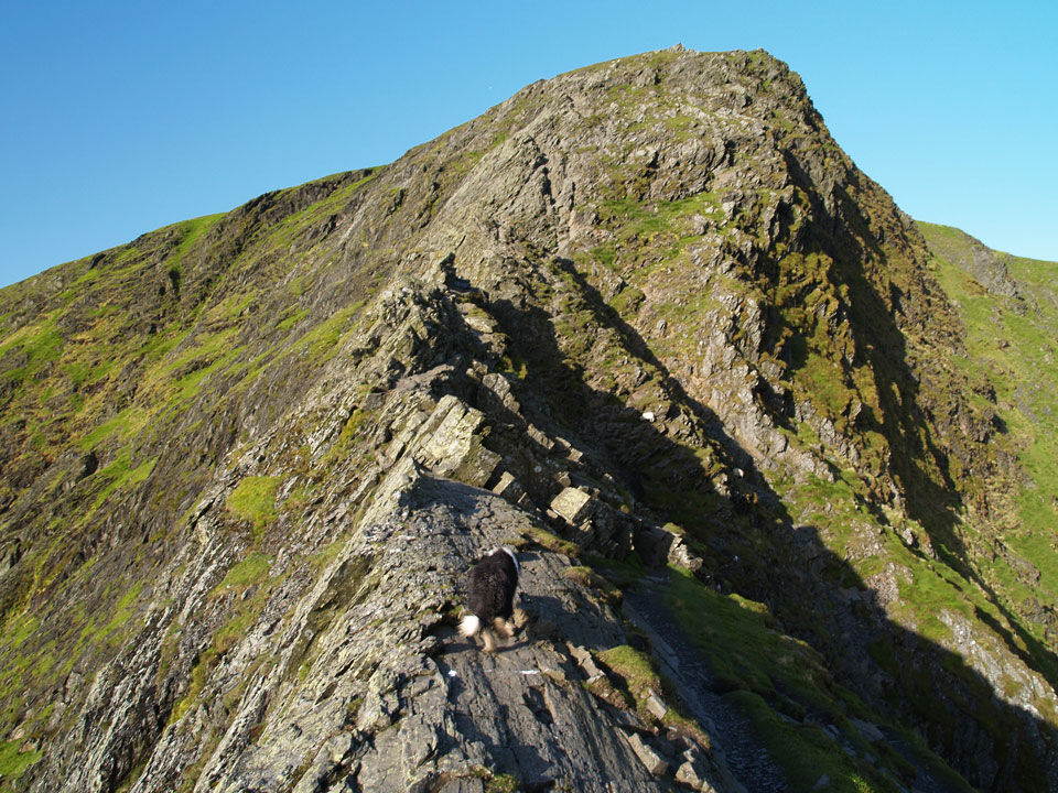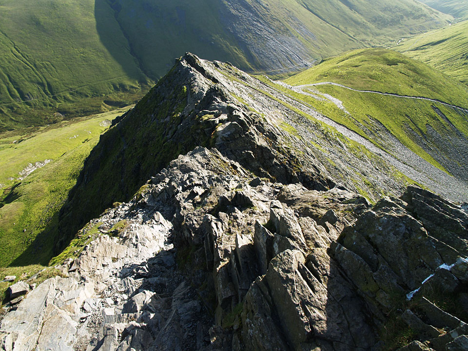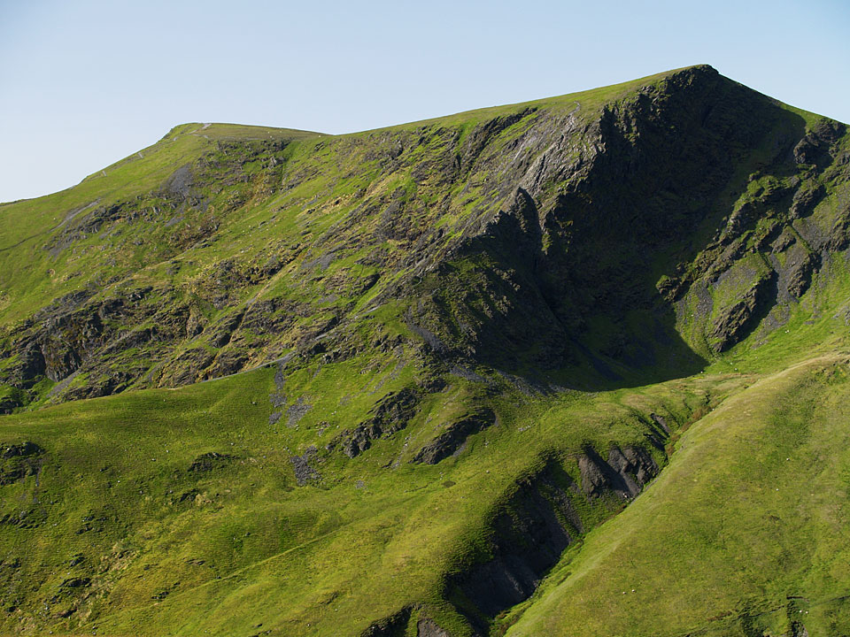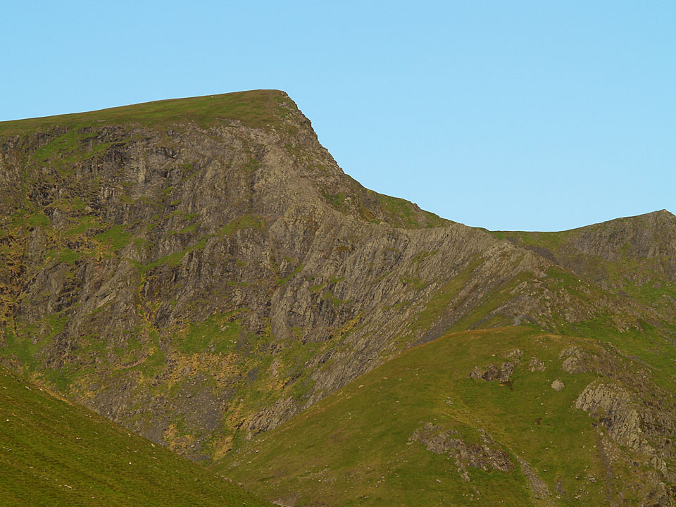 A first glimpse of Sharp Edge from Mousthwaite Comb - it is the light band of rock arcing upwards to the highest pinnacle and looks almost impossible to climb from here.