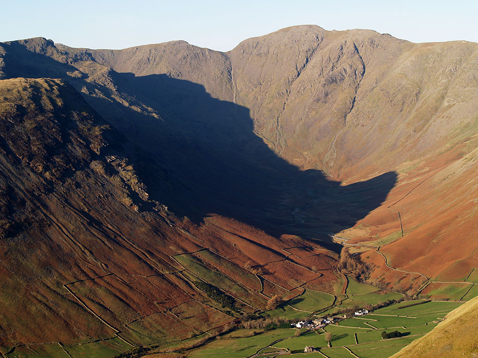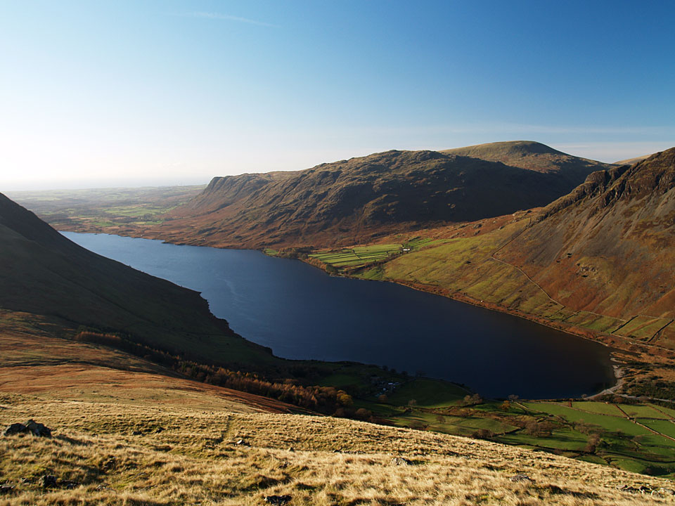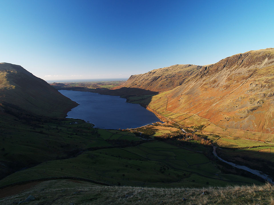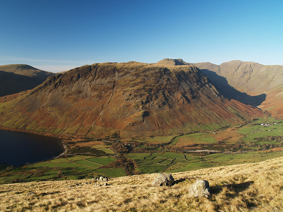 It was predicted to be clear today and I wasn’t disappointed when I went up to Scafell Pike, it was a complete contrast to yesterday’s rain. The climb to Lingmell straight up the nose is a steep one and it was really cold on this section as the sun was hidden behind Scafell for much of the ascent. The climb to Scafell Pike was bitterly cold too, being in shade until I reached the upper parts. The top was icy with little clumps of snow around but in glorious sunshine. The only fell I could see with a decent dusting of snow was Helvellyn to the east. I climbed to Scafell via Lord’s Rake and the West Wall Traverse before the steep drop down back into Wasdale. A superb days walking; conditions don’t come much clearer than this.