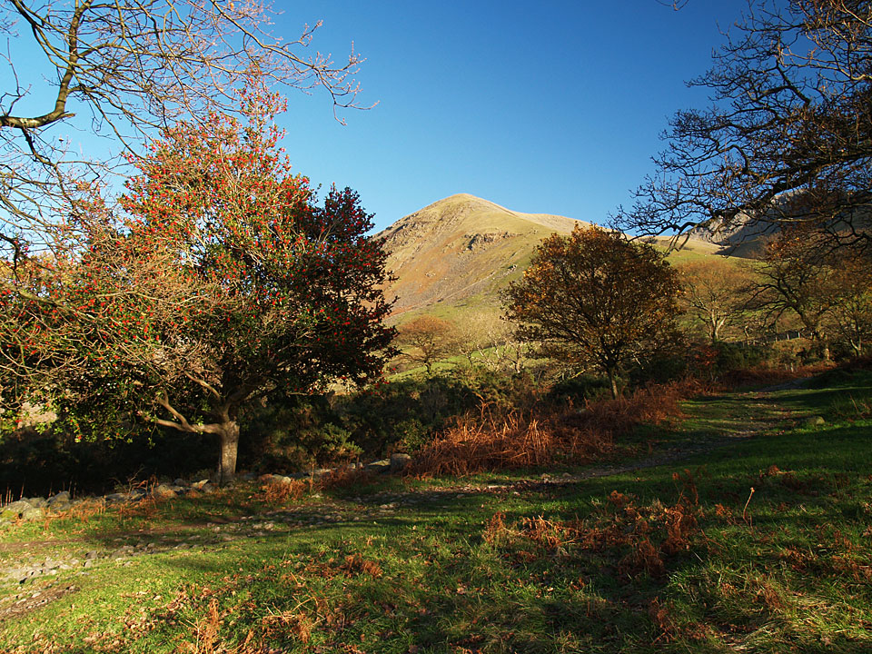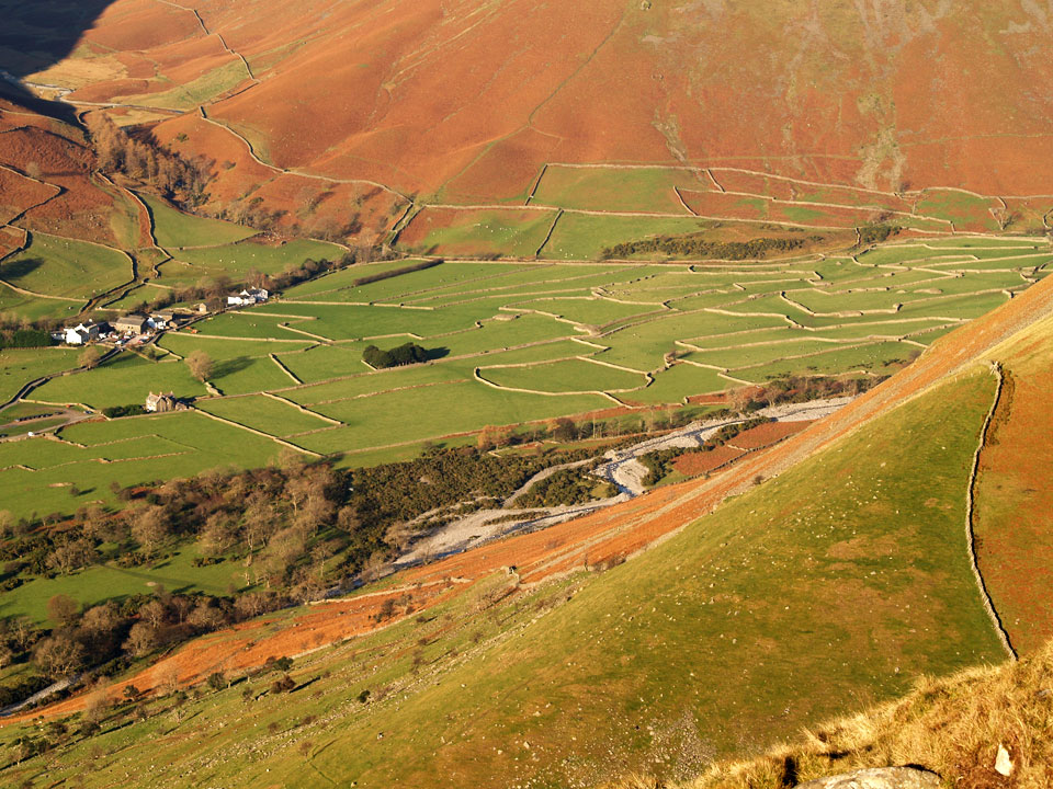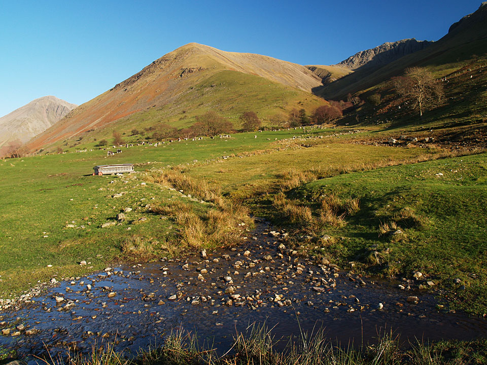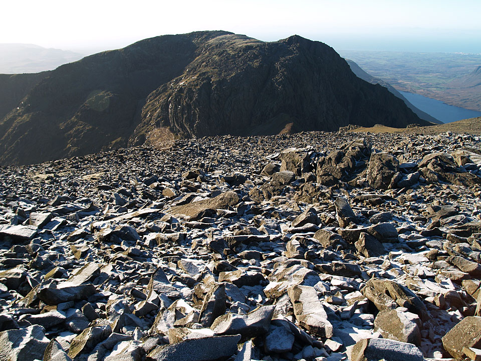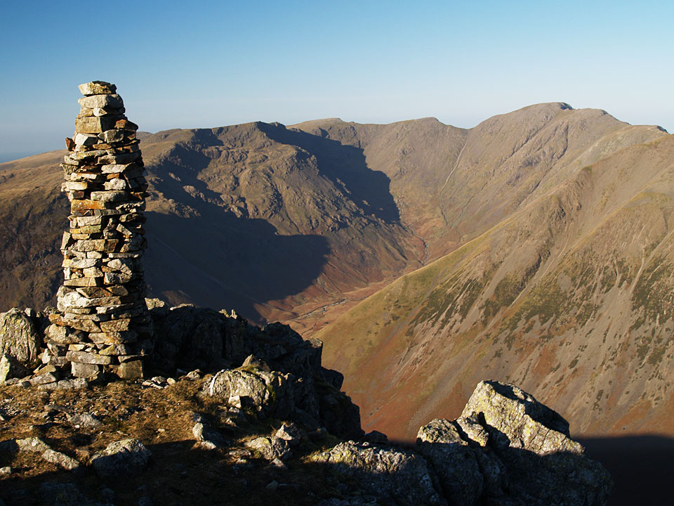 It was predicted to be clear today and I wasn’t disappointed when I went up to Scafell Pike, it was a complete contrast to yesterday’s rain. The climb to Lingmell straight up the nose is a steep one and it was really cold on this section as the sun was hidden behind Scafell for much of the ascent. The climb to Scafell Pike was bitterly cold too, being in shade until I reached the upper parts. The top was icy with little clumps of snow around but in glorious sunshine. The only fell I could see with a decent dusting of snow was Helvellyn to the east. I climbed to Scafell via Lord’s Rake and the West Wall Traverse before the steep drop down back into Wasdale. A superb days walking; conditions don’t come much clearer than this.