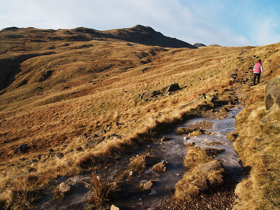 Crinkle Crags and Bowfell come into view as the path climbs.