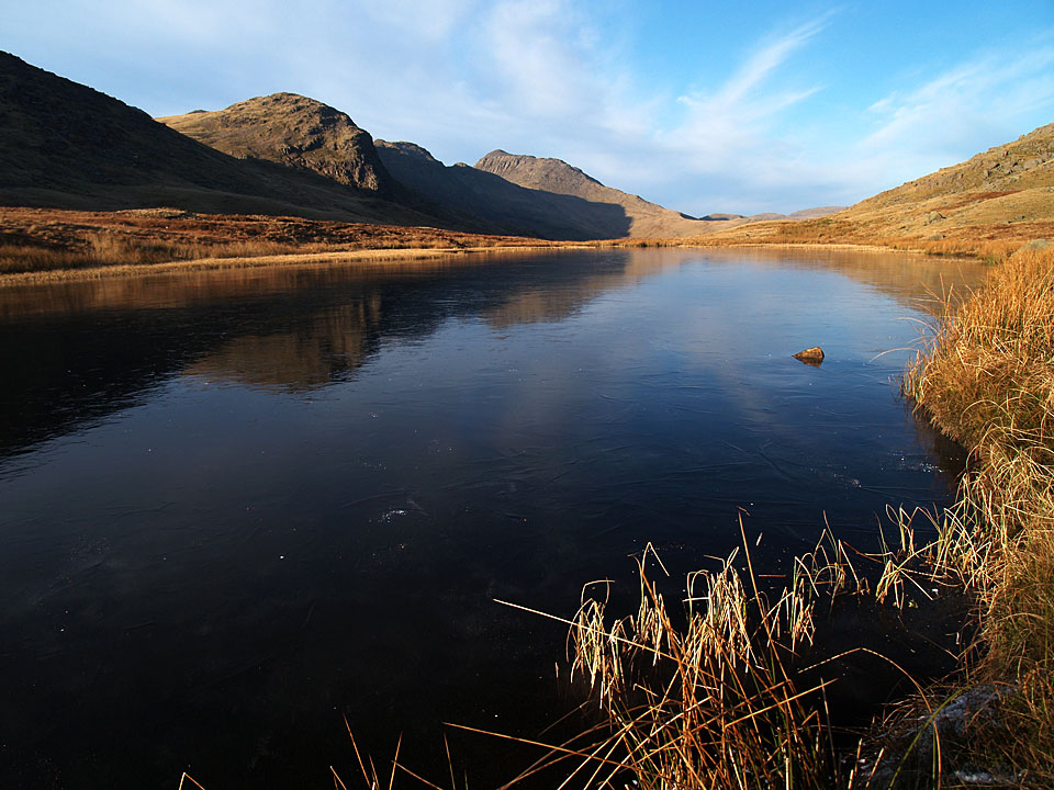 There is a great view to Bowfell across a frozen Red Tarn.