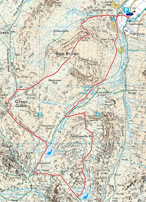 Seathwaite – Hanging Stone – Base Brown – Blackmoor Pols – Green Gable – Windy Gap – Styhead Tarn – Sty Head – Sprinkling Tarn – Great Slack on Seathwaite Fell – Seathwaite Fell – Taylorgill Force – Seathwaite