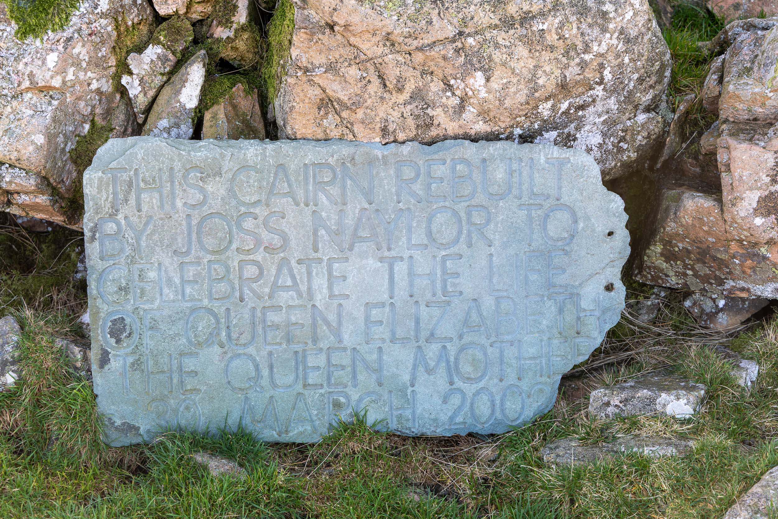 The plaque at the foot of the Joss Naylor cairn, rebuilt by him to celebrate the life of Queen Elizabeth The Queen Mother. I have been at this cairn twice with Joss himself and I know he enjoyed building it.
