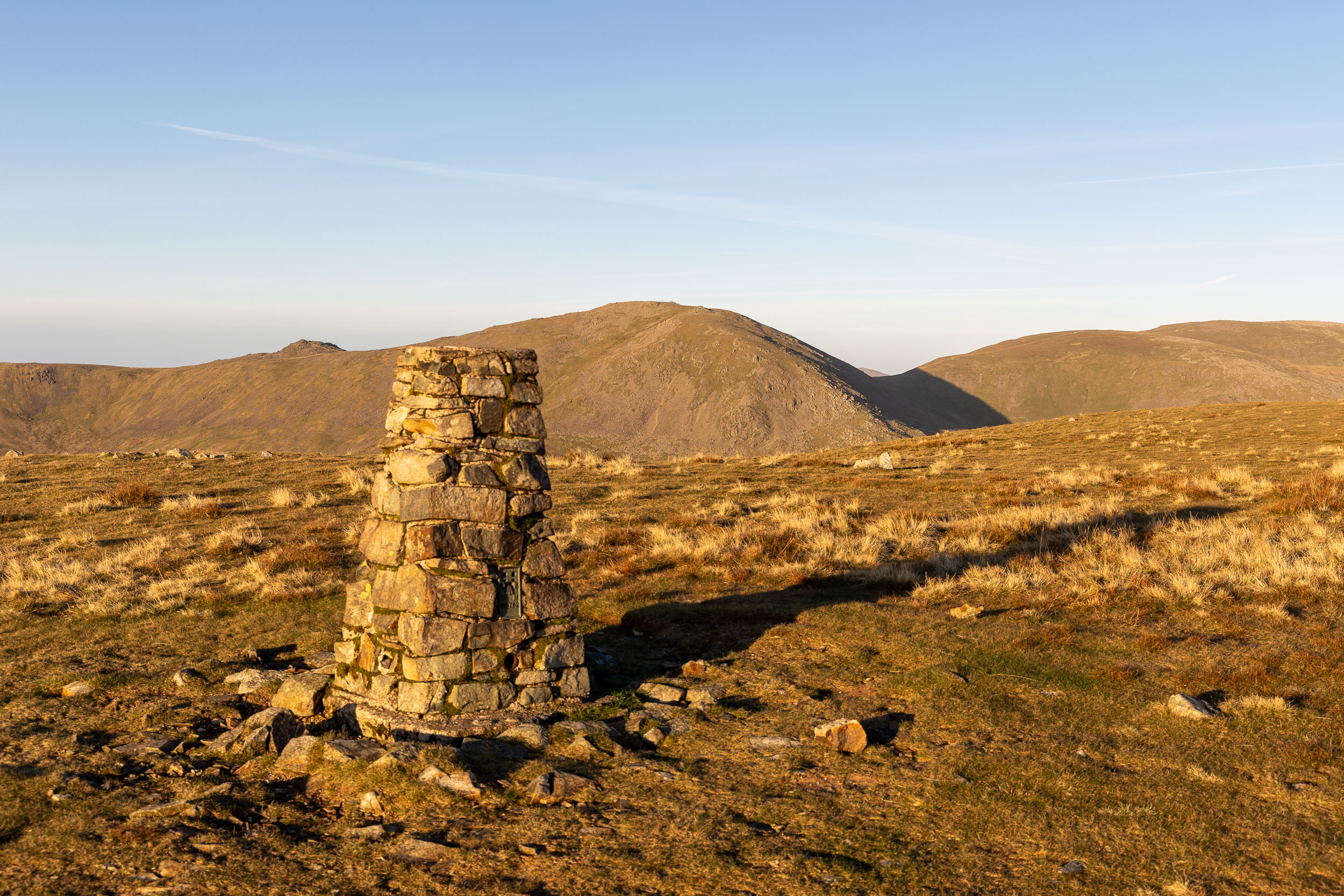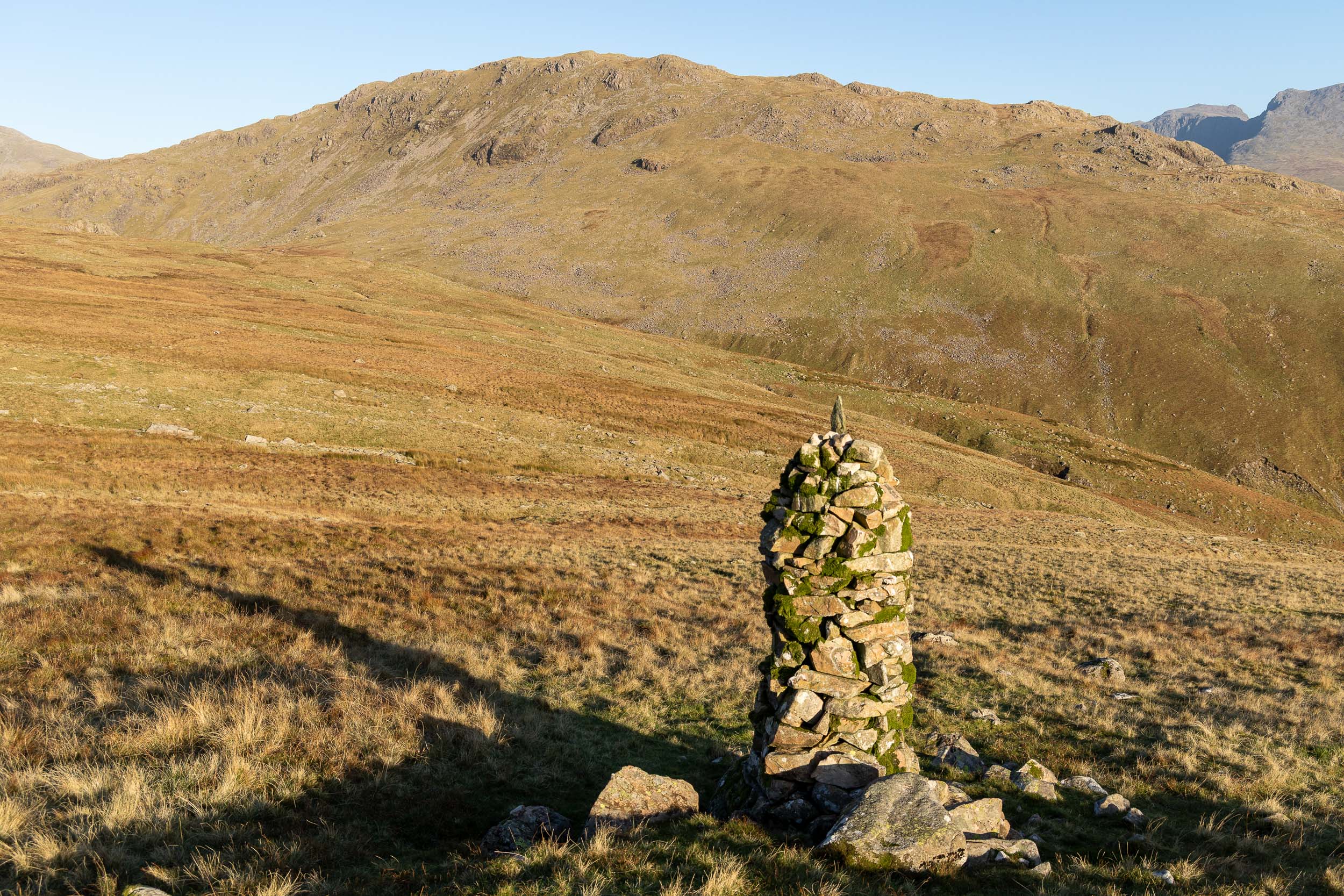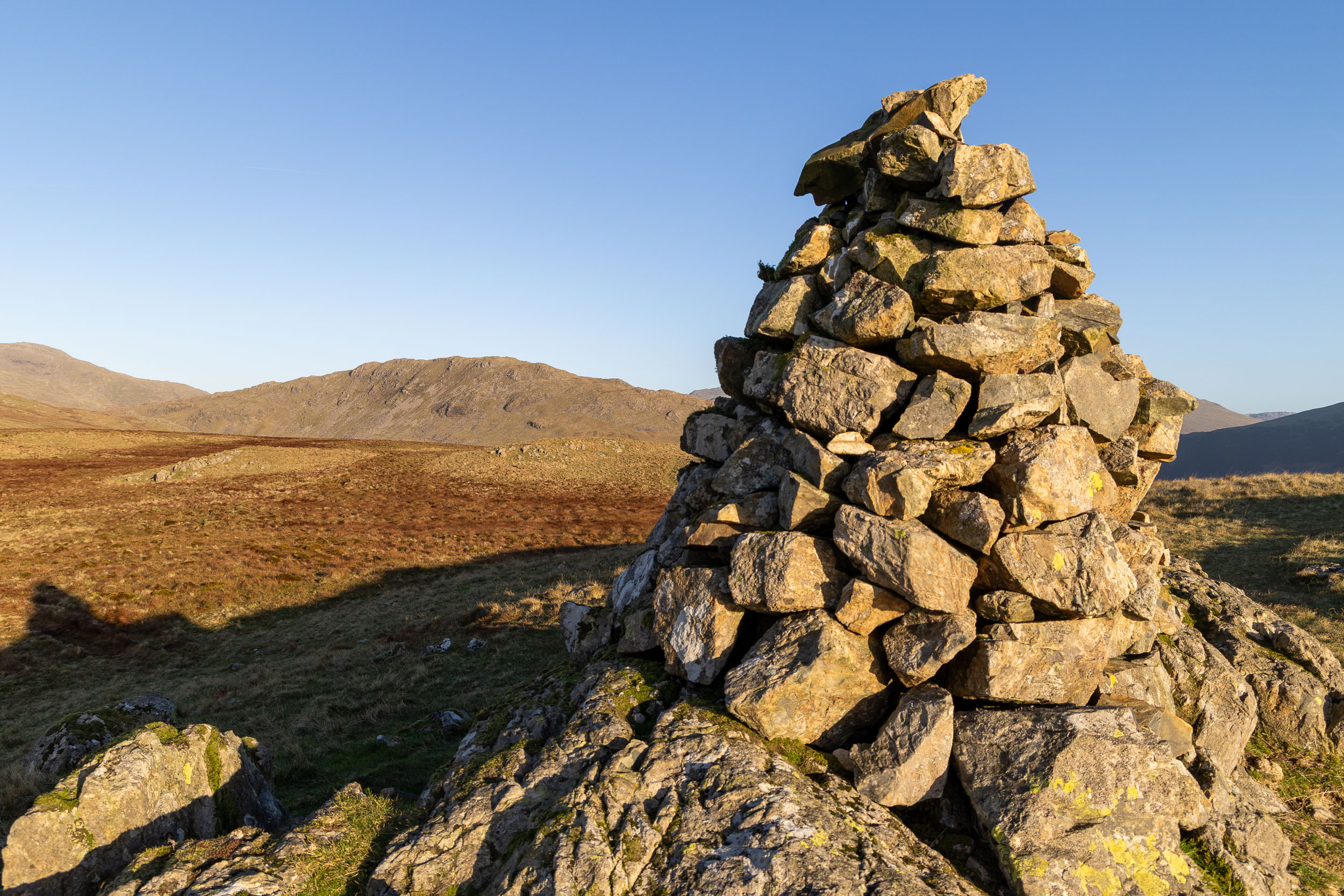 There was further bogginess on the next section climbing to Glade How, although a lot of the puddles were now iced over. As we climbed I could already 'feel' the sun starting to set and this is noticeable in the colour changes in the photos and of course the lengthening shadows. This is the cairn on Glade How looking at the next section of the climb to Cat Bields.