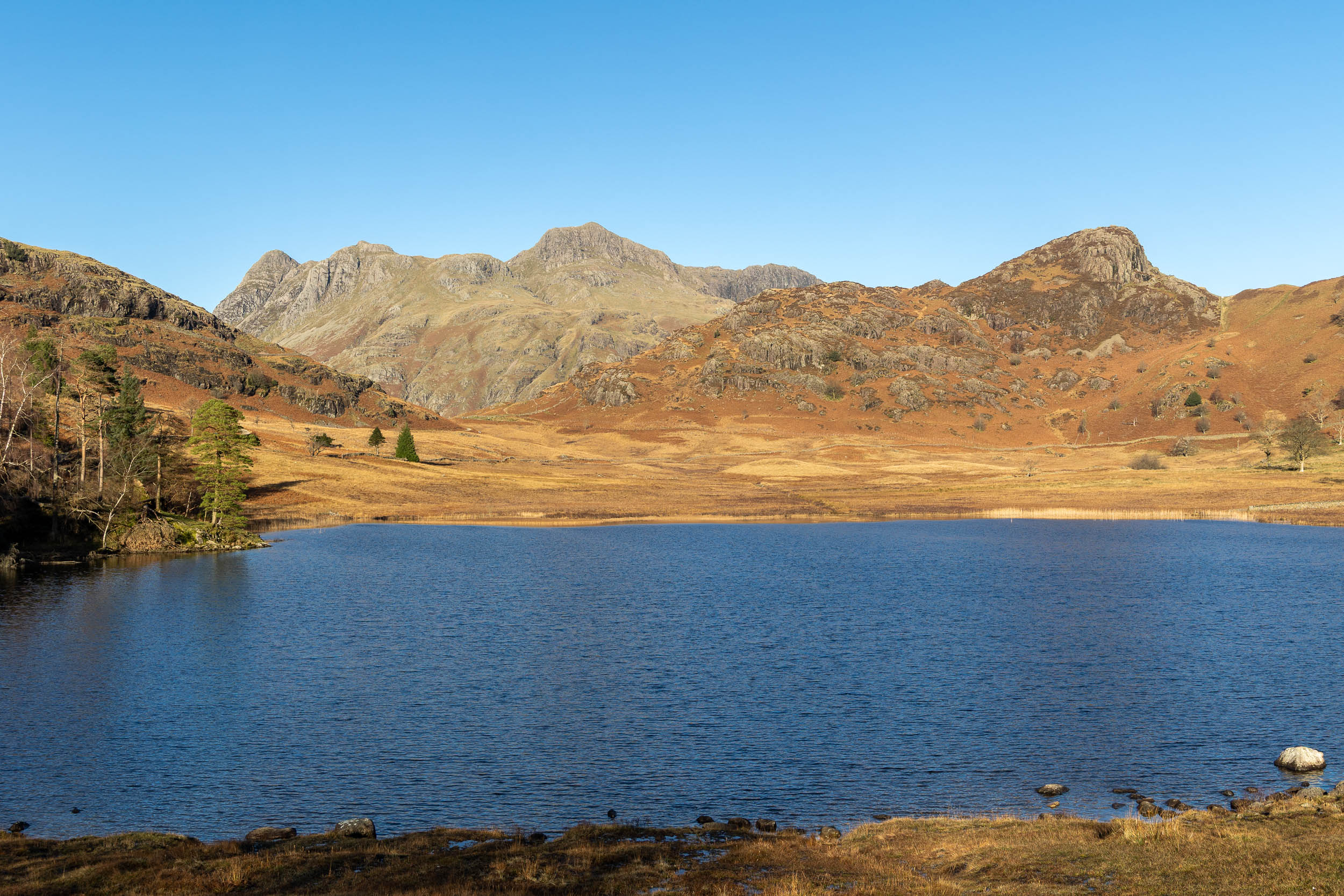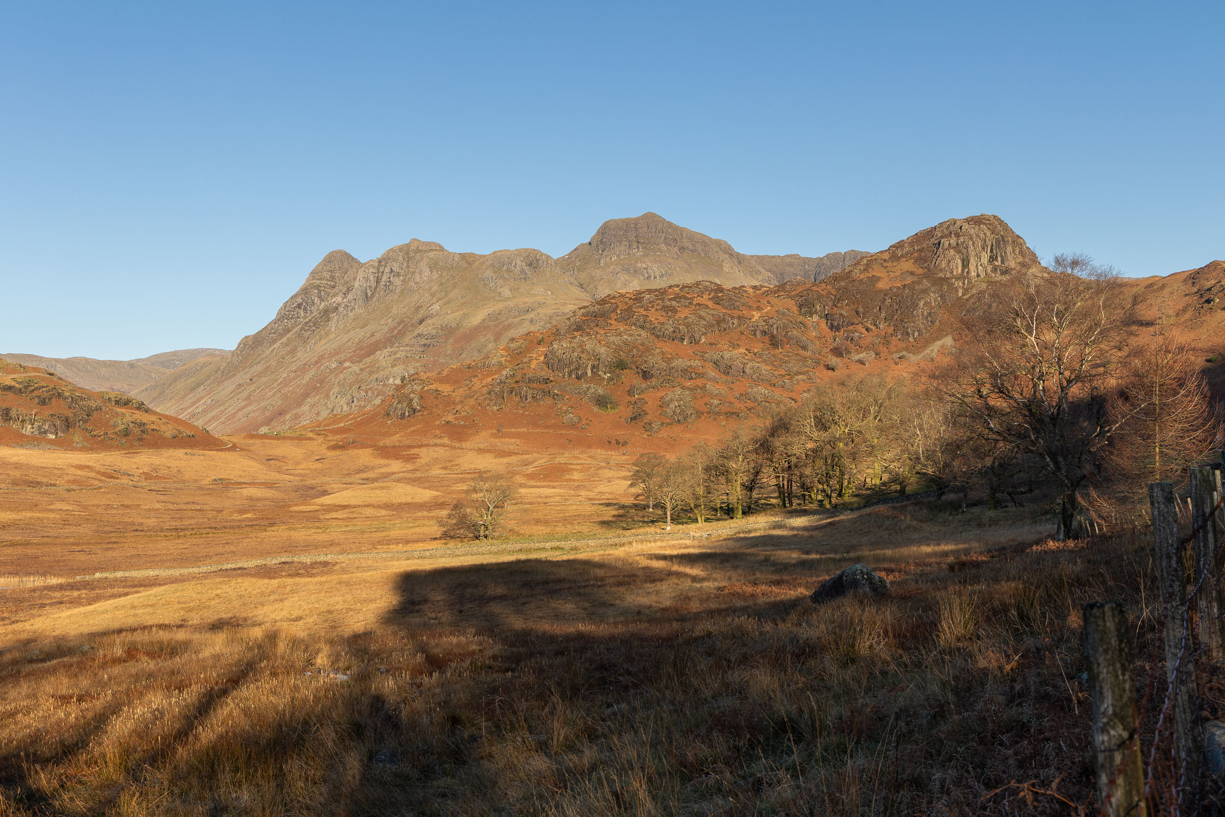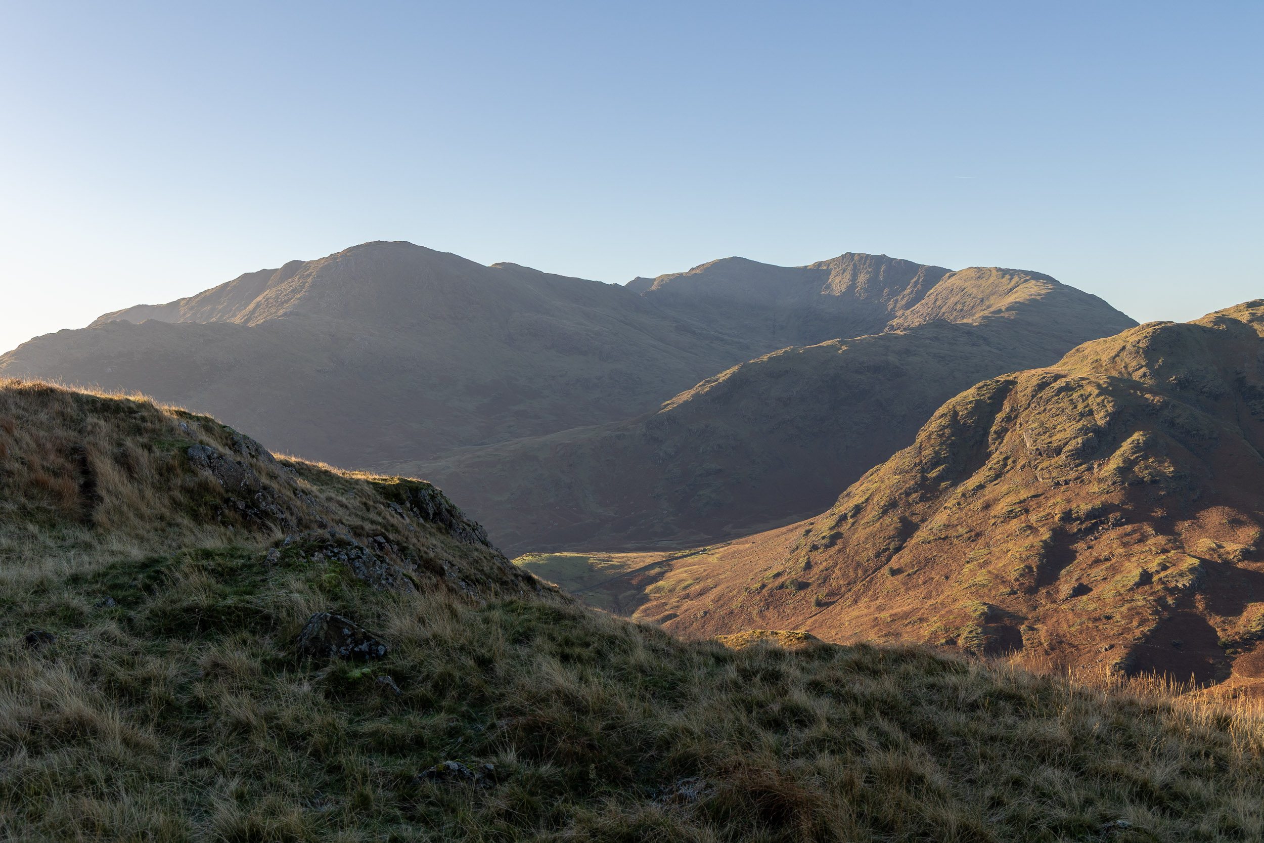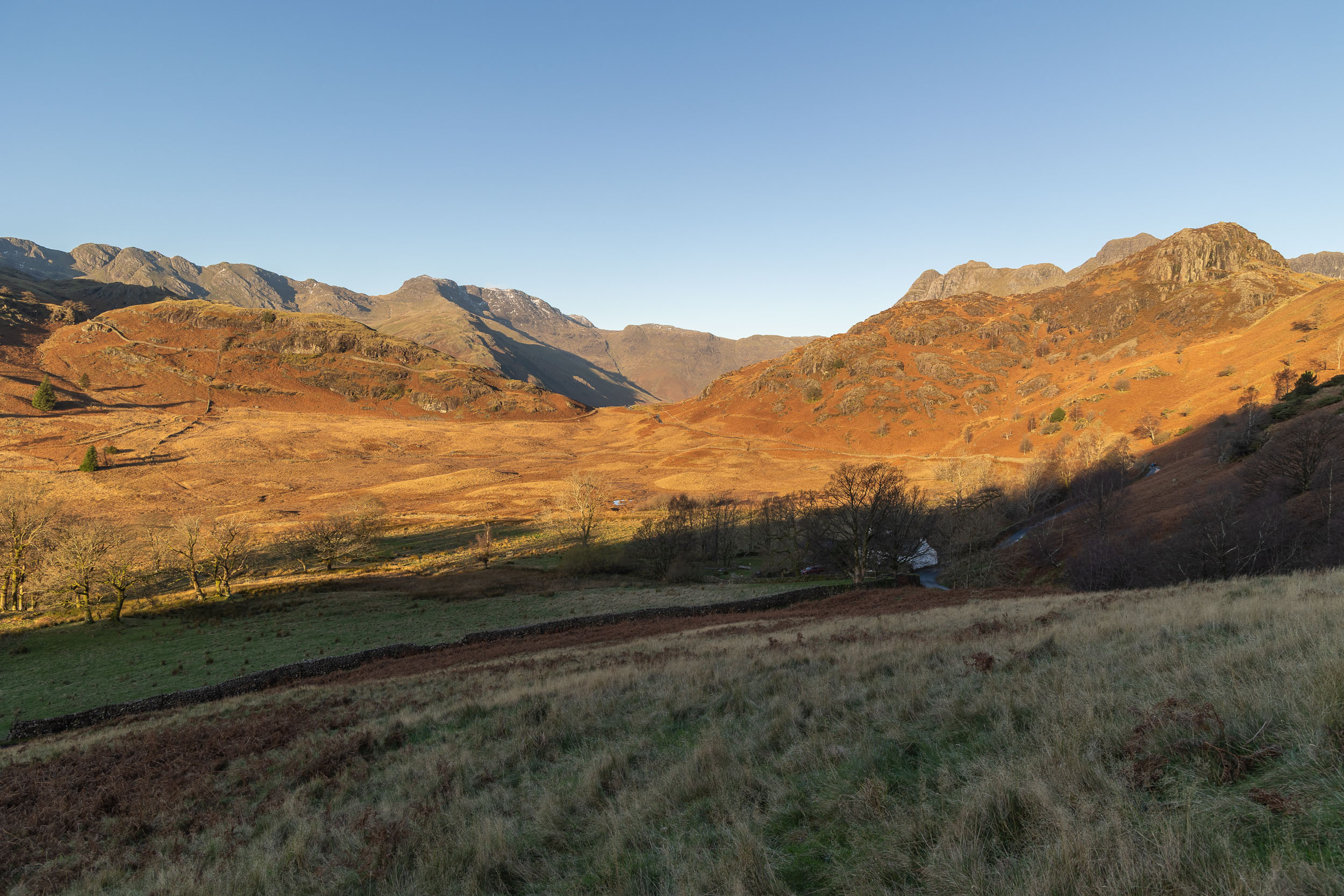Straight from the car park close to Blea Tarn there is a fantastic view from the road already with the early light on the Langdale Pikes and Side Pike.