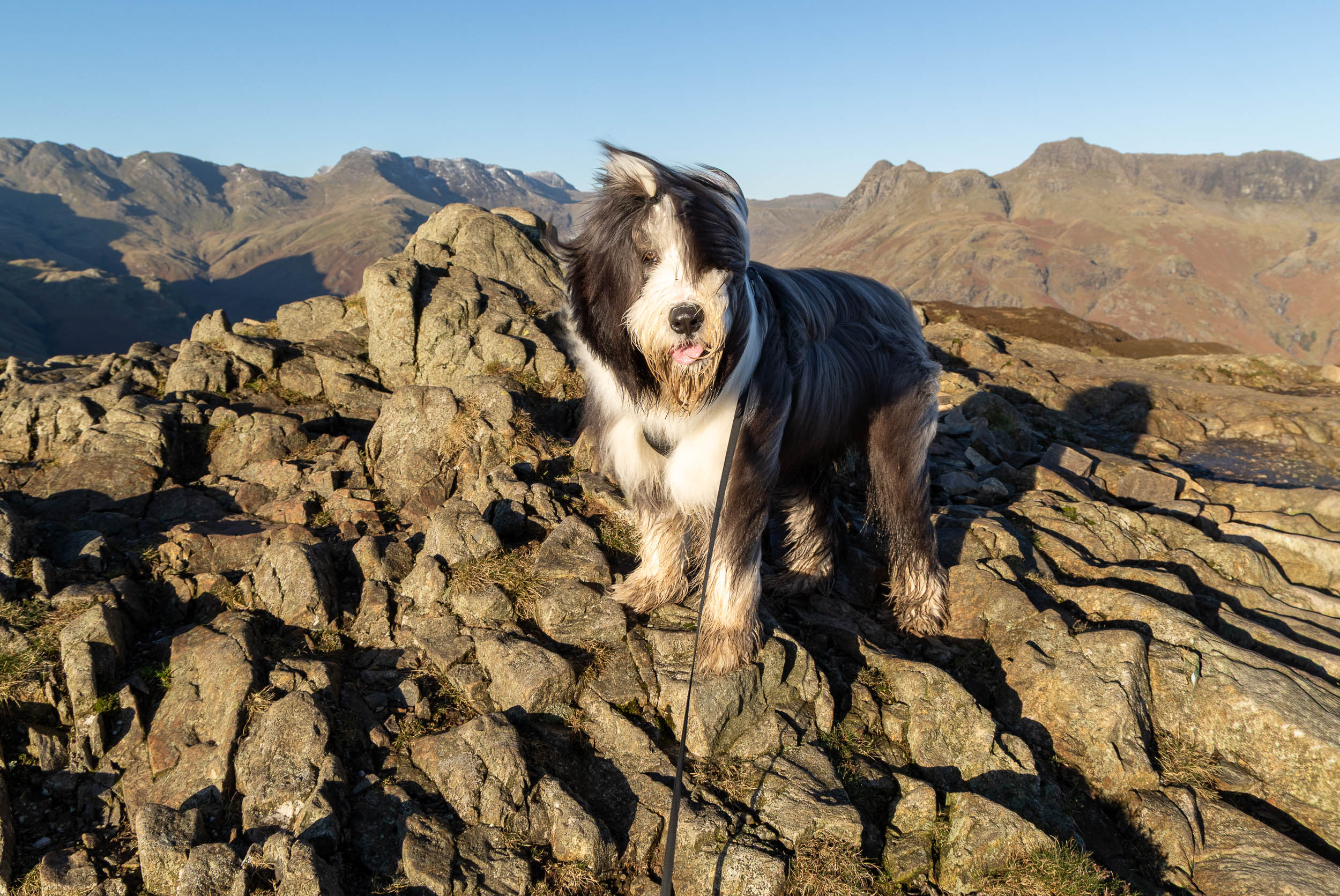 Today turned out to be another blue, clear sky day in between a few less favourable ones weather-wise. Lingmoor Fell is a relatively easy walk but one which offers fine views and gets up close and personal with some of the bigger fells such as the Langdale Pikes and Bowfell – another great training ground for young Finlay then! He is looking more grown up by the day, they don’t stay pups for long.
