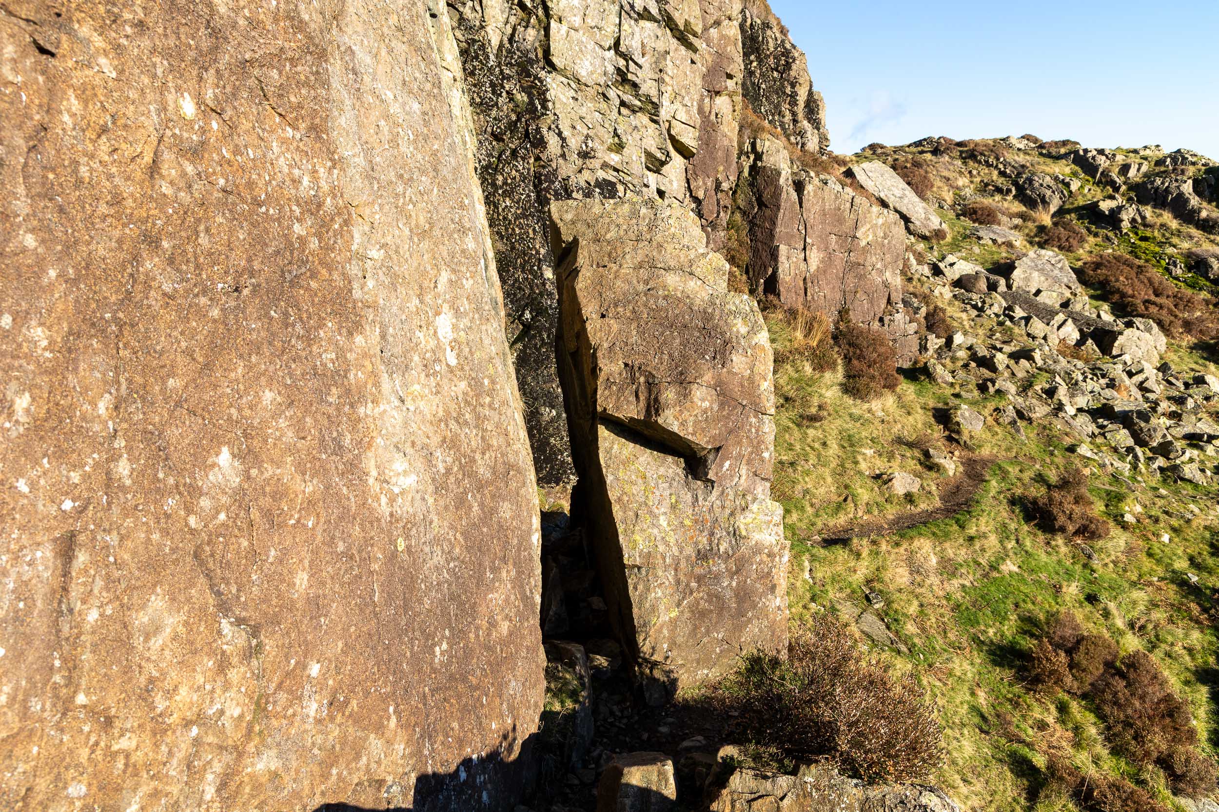 Yes there is, and this is the key to climbing it through this thin gap in the rock (known as The Squeeze or slightly less flattering as 'Fat Man's Agony'). Thankfully I was still able to make it through (!) and Finlay was back and forth through it a few times!