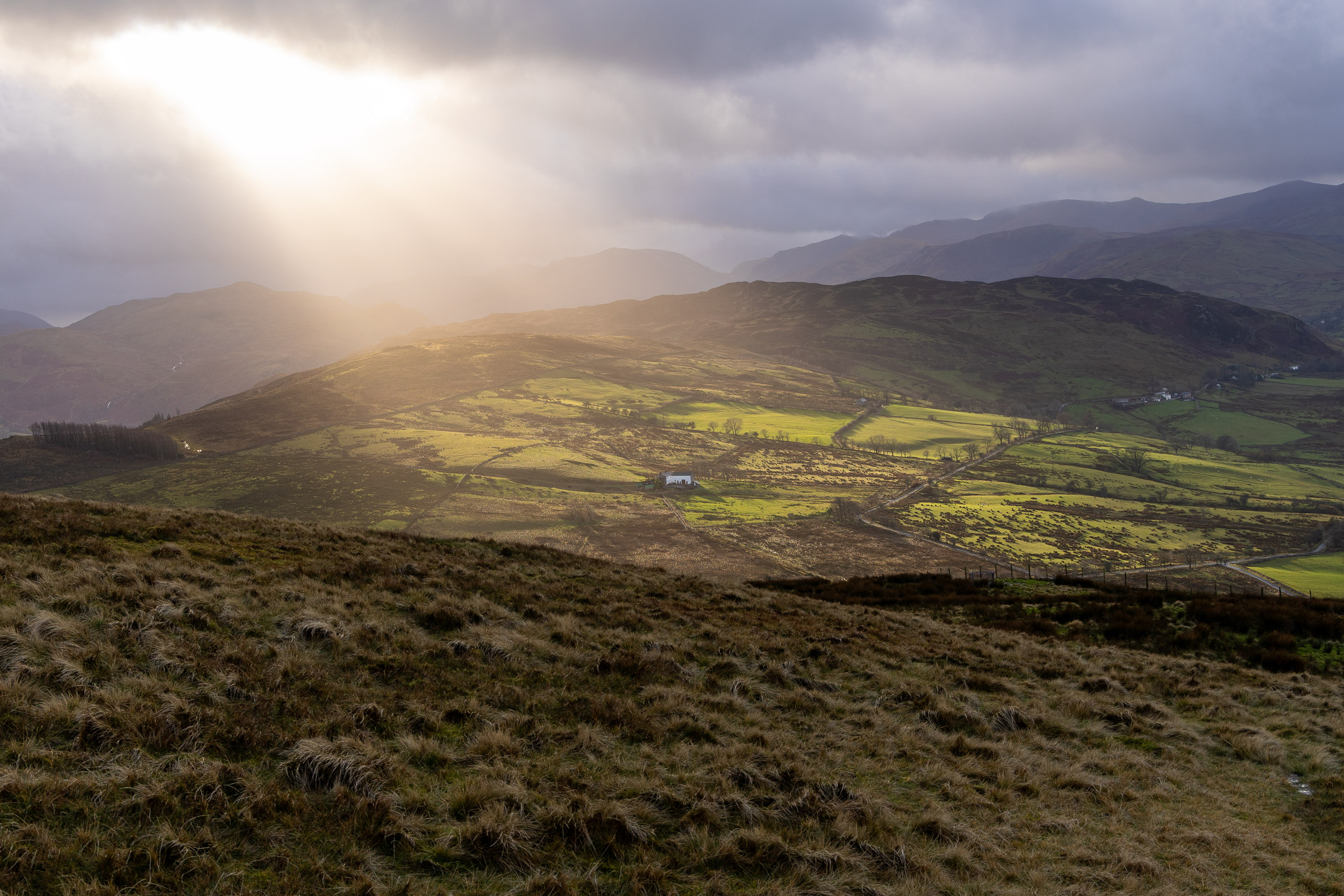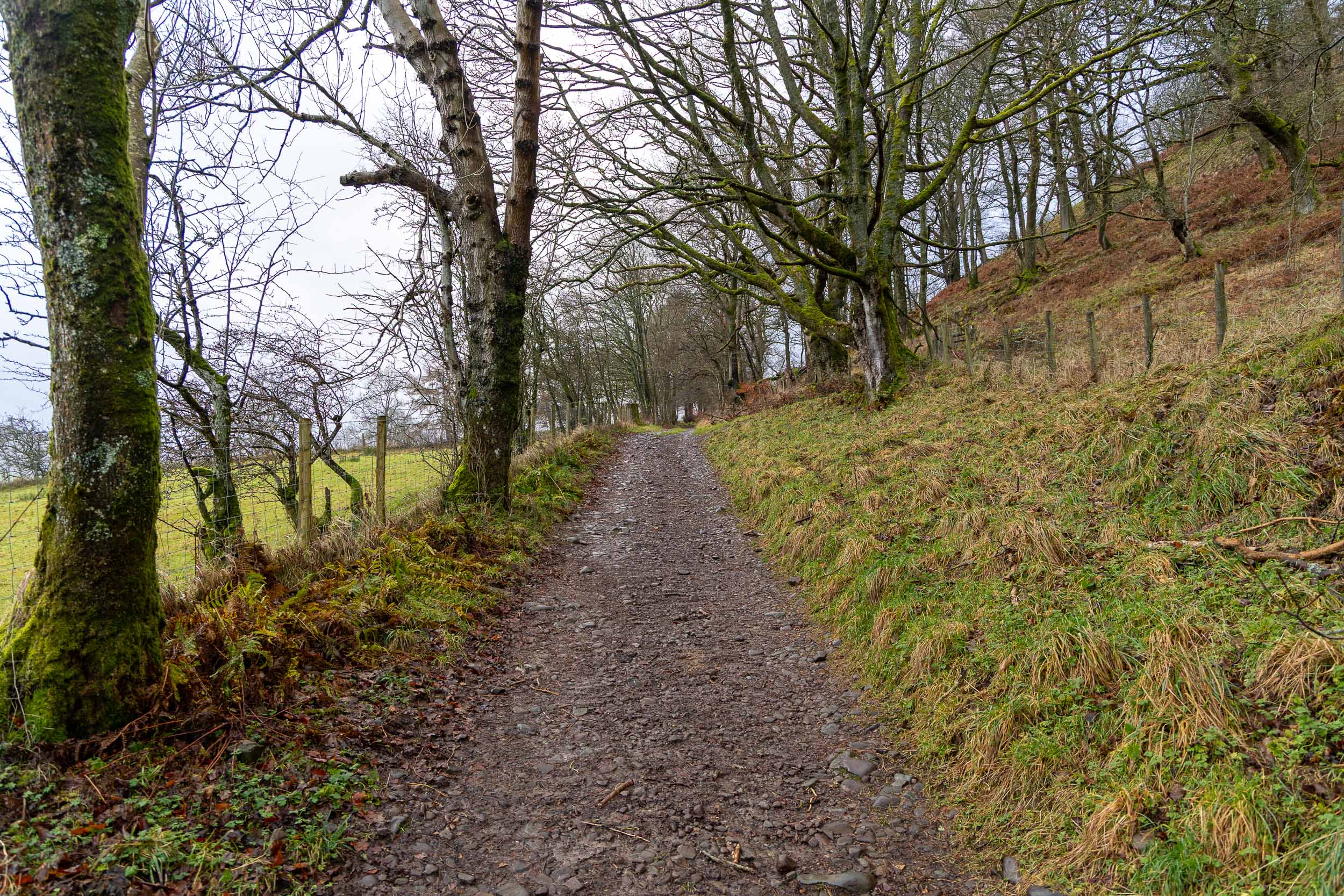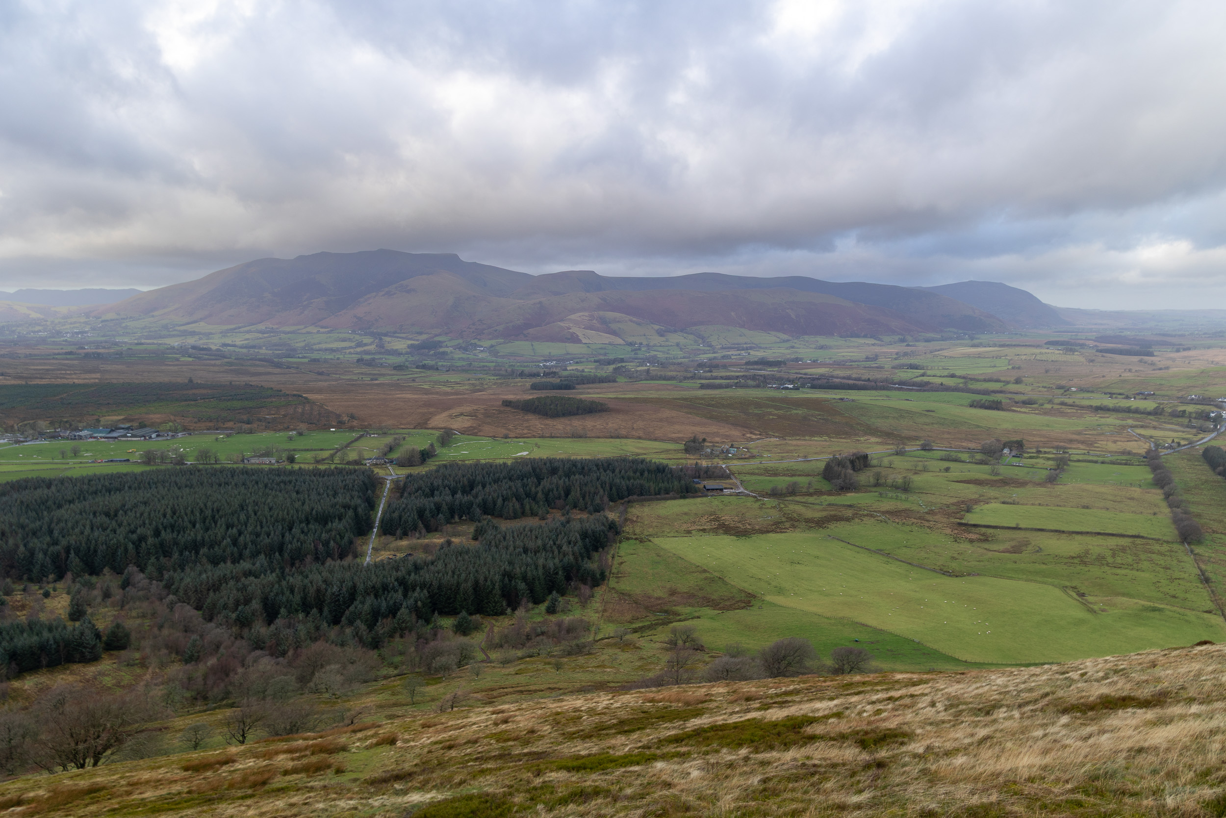 There was a steep descent from here to pick up the lower level path that circumnavigates the fell where we arrived at the car…should I, shouldn’t I? Of course I carried on, I was here now! For anyone who is going to follow a similar route to mine, the paths between Brownrigg Farm and Greenrow are not the best to say the least. At this time of year and after so much rain, the field paths were a real bog fest. Coupled with this was the crossing of two stiles one after the other immediately followed by a footbridge crossing with a further two stiles on it – none of these were dog friendly. Further stiles at Greenrow were also not conducive to a dog getting through easily! I wasn’t particularly looking forward to coming back this way.