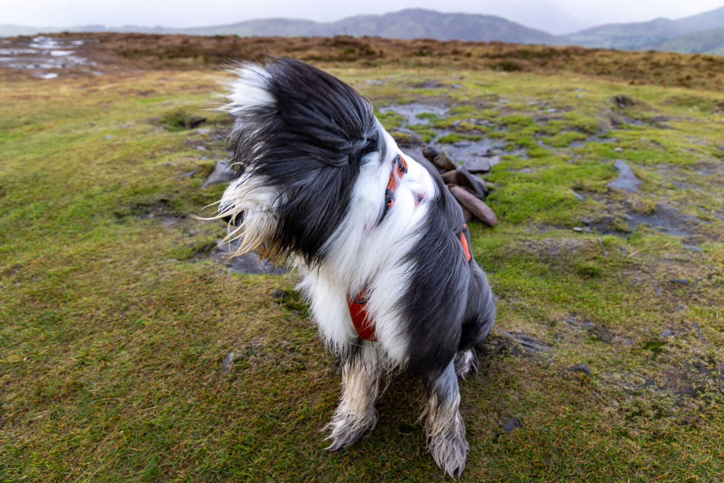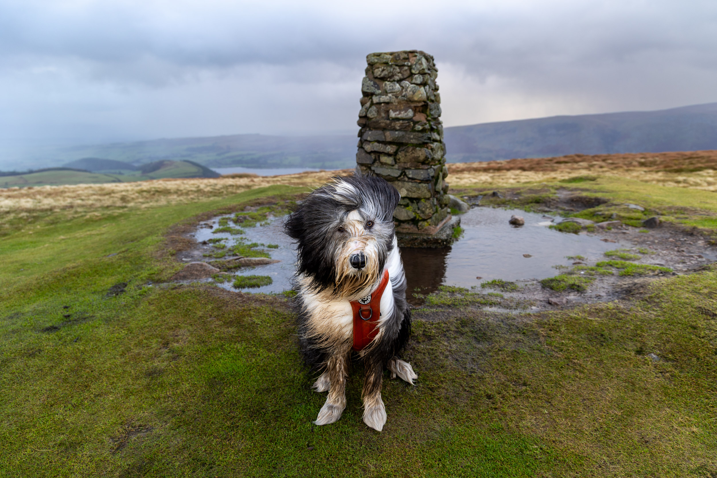 It was mostly rain on the way to Little Mell Fell, we walked a quiet tarmac lane to Lowthwaite and then the lower fell path to The Hause. From there it is the short, steep climb to the top of Little Mell Fell, Wainwright #16 for Finlay. He is one mucky pup now, that’s for sure and the wind was once more fierce up here.