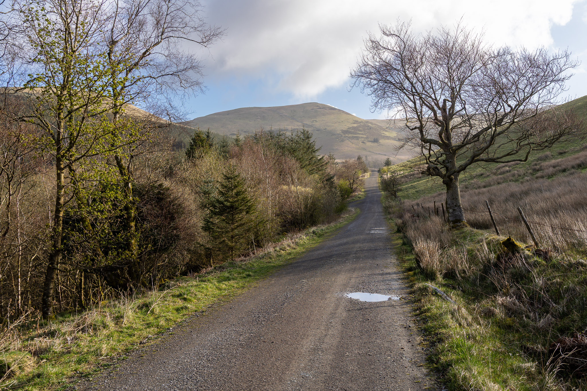 This is it! There is no distinct top but this is the highest point of Tarbarrel Moss. From here there was a descent through a short forested section and out onto the forest road. Walking along the forest road, we encountered a Roe Deer – it was quite bold really even though Finlay was going through himself when he caught sight of it (he was on a lead) and it nonchalantly strutted off into the forest to disappear once more.