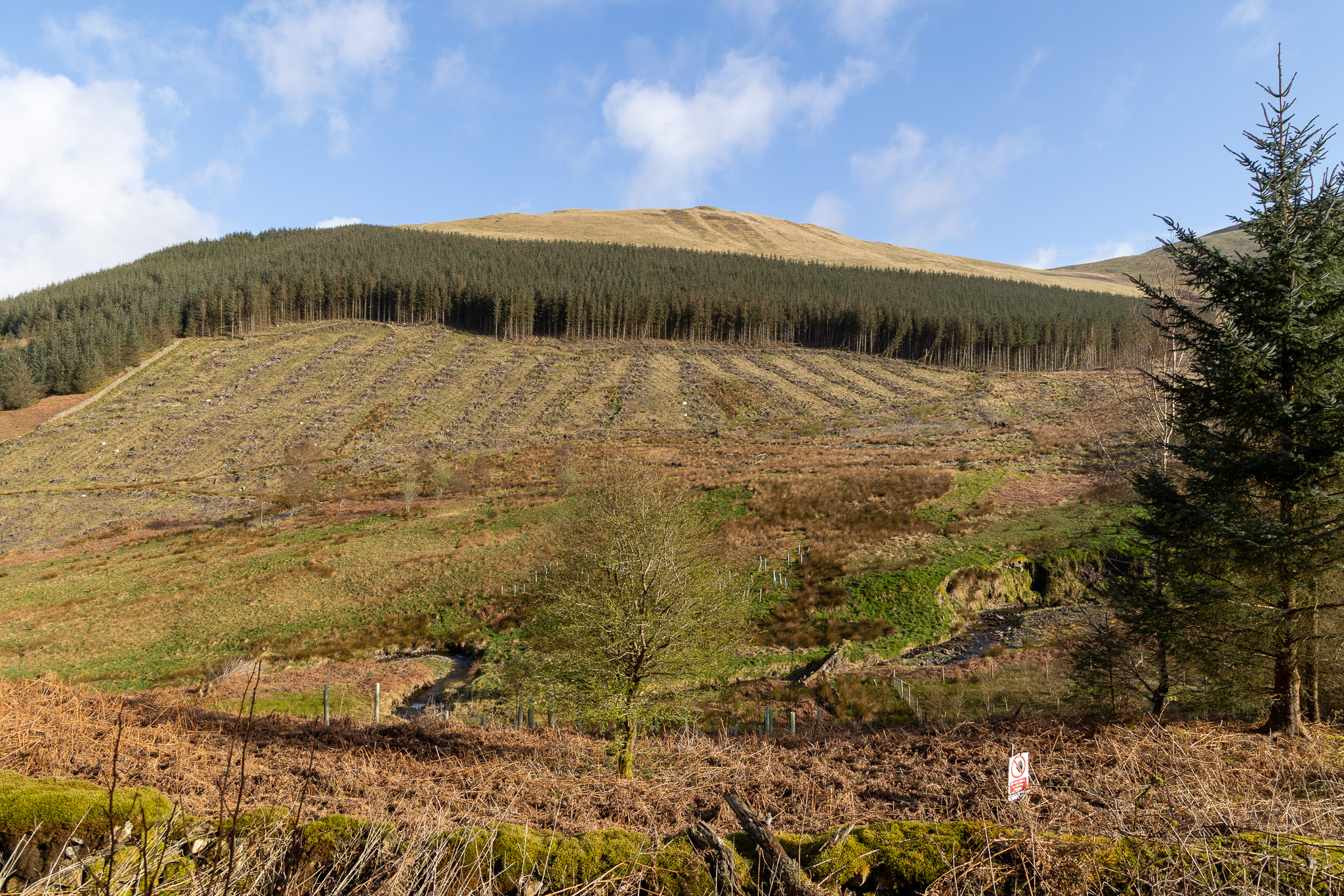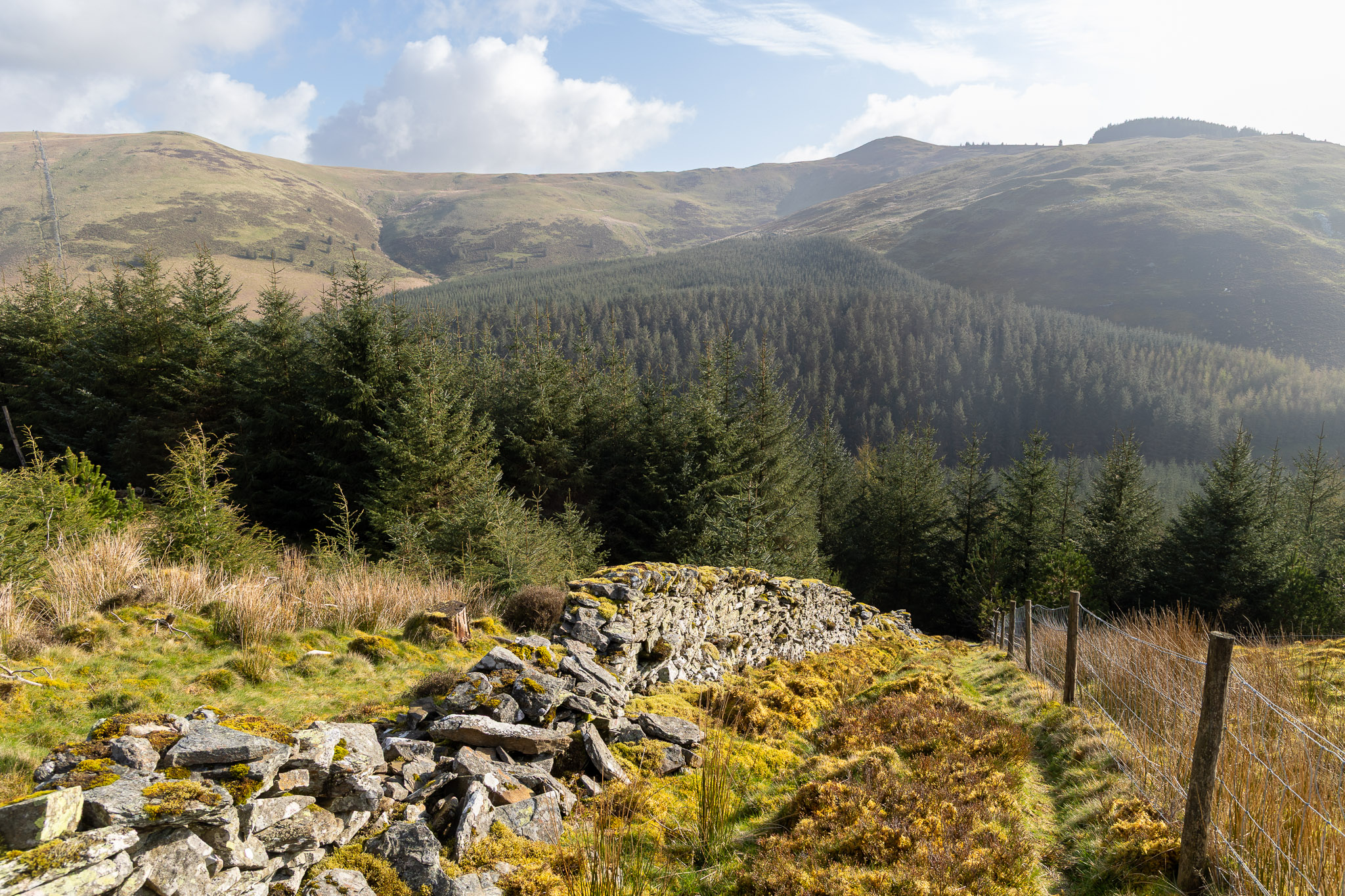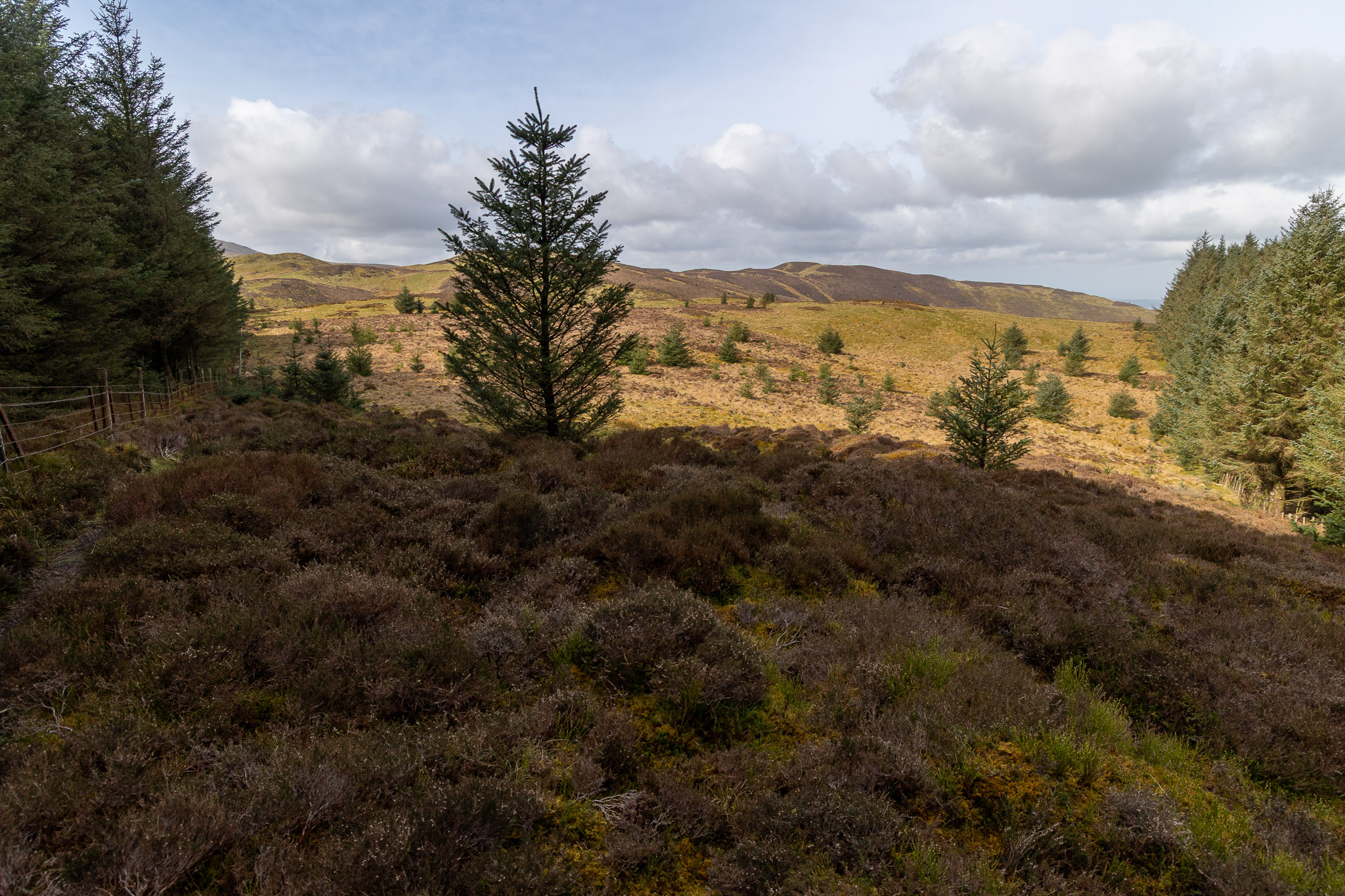 Finlay checks out the route to the next target, the top of Tarbarrel Moss which is the corner of the trees directly ahead. As it turned out we chose the wrong (direct) path which ended up being a boggy mess. A smarter move would be to head directly east to the fence and then follow the one of the fence right to left in this photo.