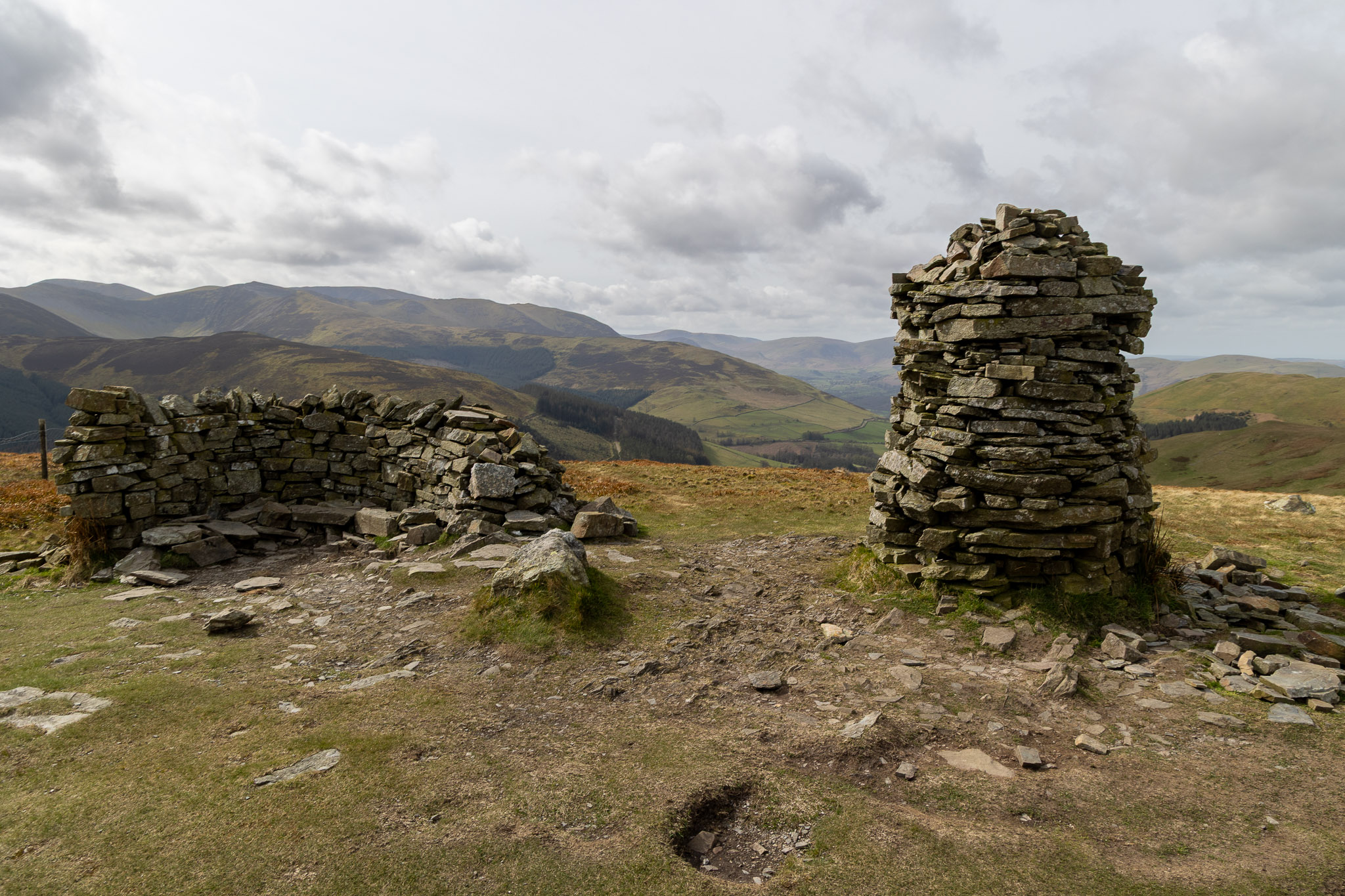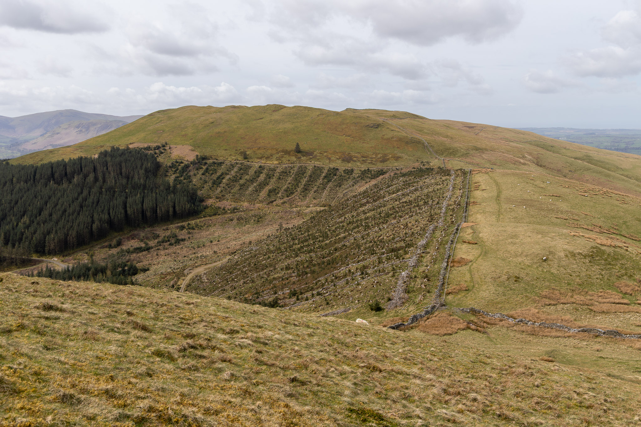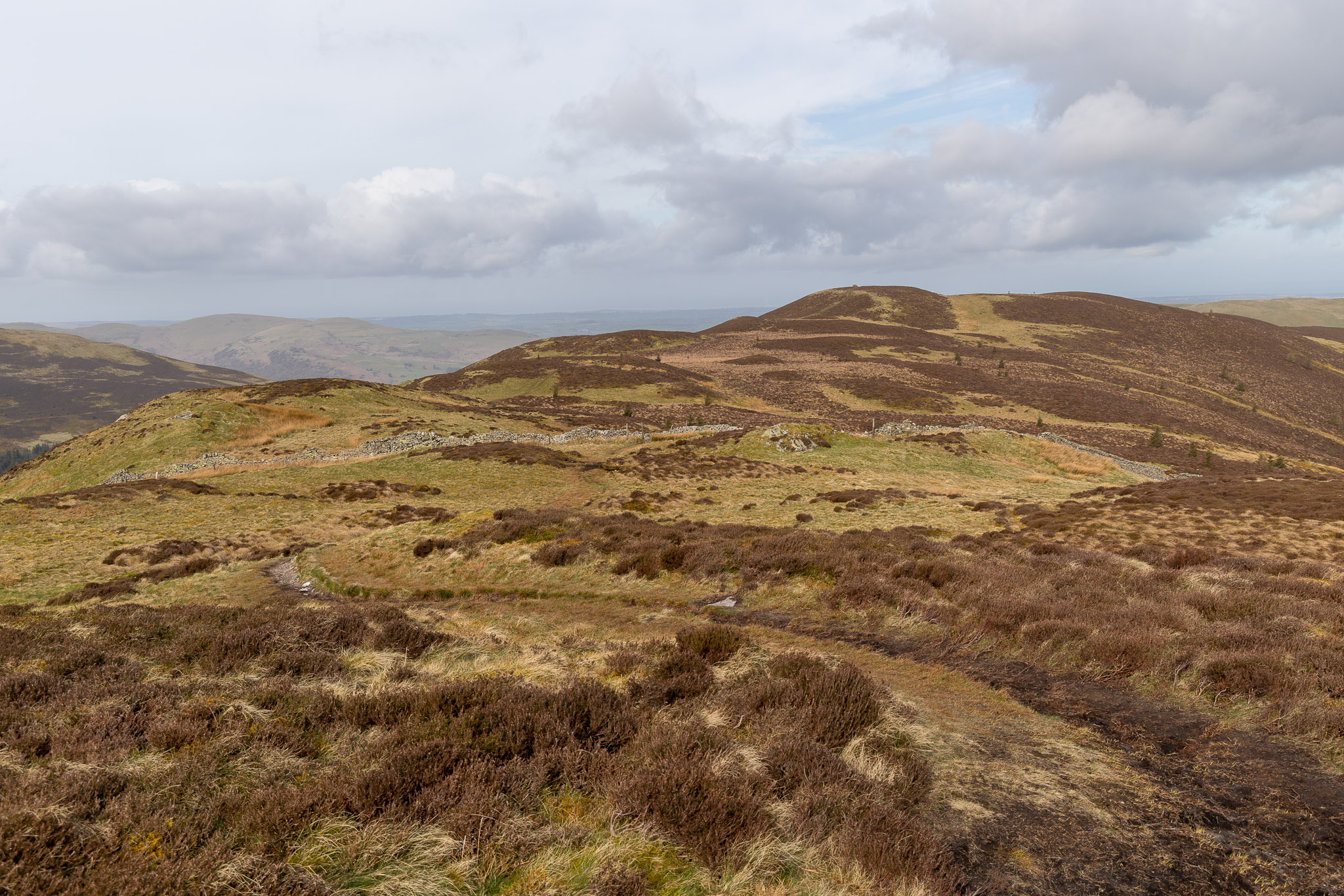…and looking back from Whinlatter Top along the path walked, Brown How wind shelter and summit cairn visible on the horizon.