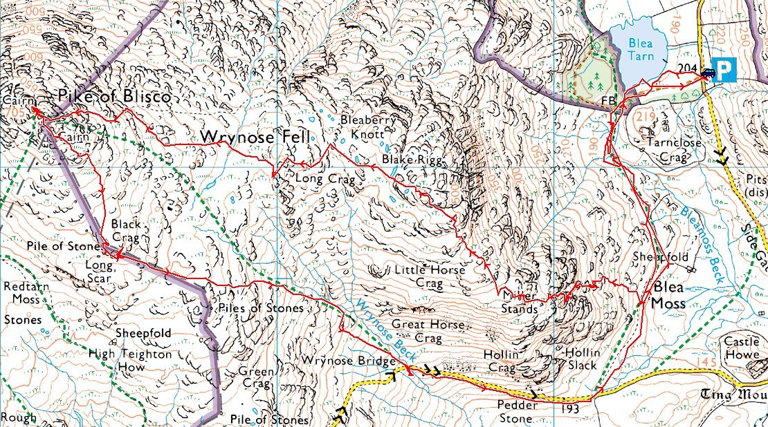 Blea Tarn – Blea Moss –Â Blake Rigg (Little Langdale) (252) – Long Crag on Wrynose Fell (253) – Pike O’ Blisco – Black Crag – Wrynose Bridge – Blea Moss Blea Tarn