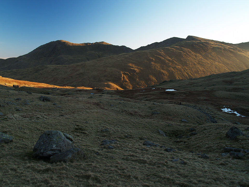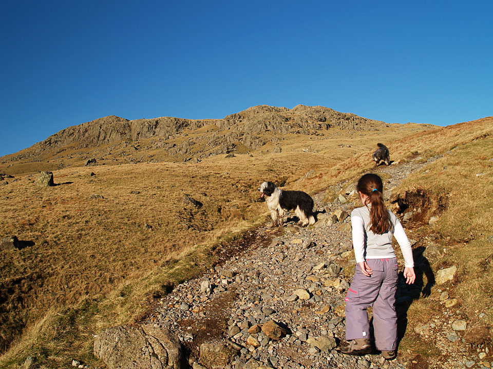 We started off in coat, gloves and hat but once up in the sunshine it was really quite warm. Here we're heading for Red Tarn with Pike o' Blisco up ahead. I wonder who ended up carrying all the gear?