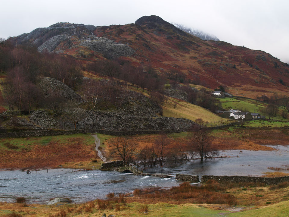 Great Intake above Slater Bridge, the snow topped Wetherlam is just peeping from under the clouds. Greenburn Beck is looking pretty full after all the rain.