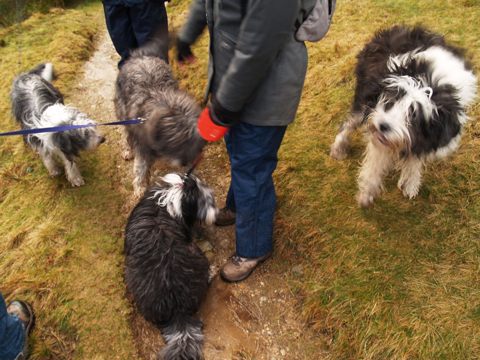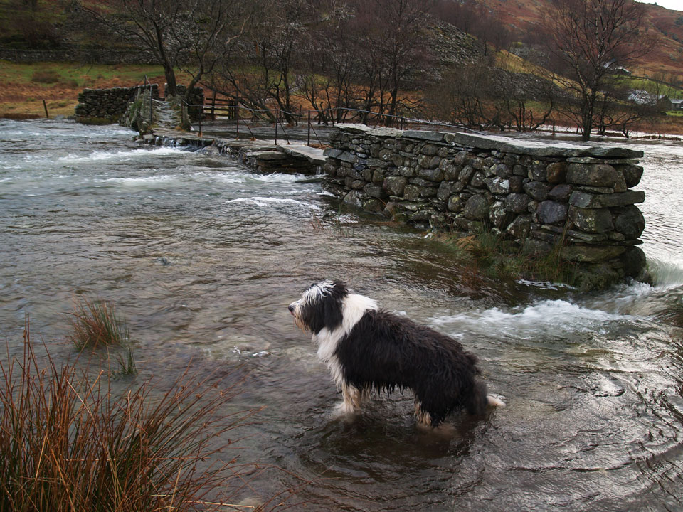 Casper doesn't seem so bothered about how full it is though. To his right, the river is flowing over the path to the bridge, so not much chance of getting across it today. Later we saw a couple attempt it from the other side but they quickly decided against it.
